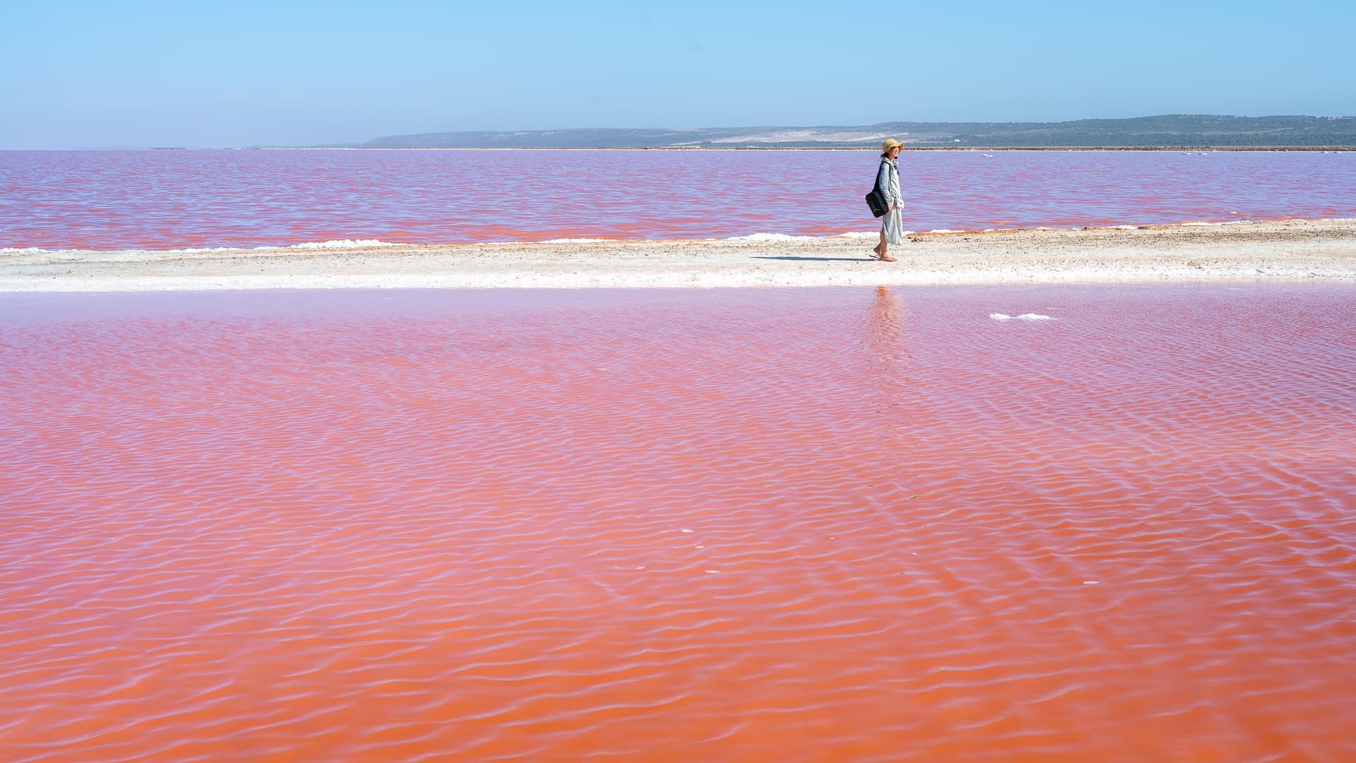 离开Kalbarri,下一站是西澳华人圈旅游名片的粉红湖。从湾区到犹他到波多黎各再到南美,很多盐湖都会在特定的季节因为微生物的繁殖成为粉红色,而位于西澳Gregory附近的Hut Lagoon Pink Lake则是其中翘楚——多年以来颜色稳定,不会变成棕色/褐色,一直饱和度爆炸高,且面积广大,视觉效果极为震撼。