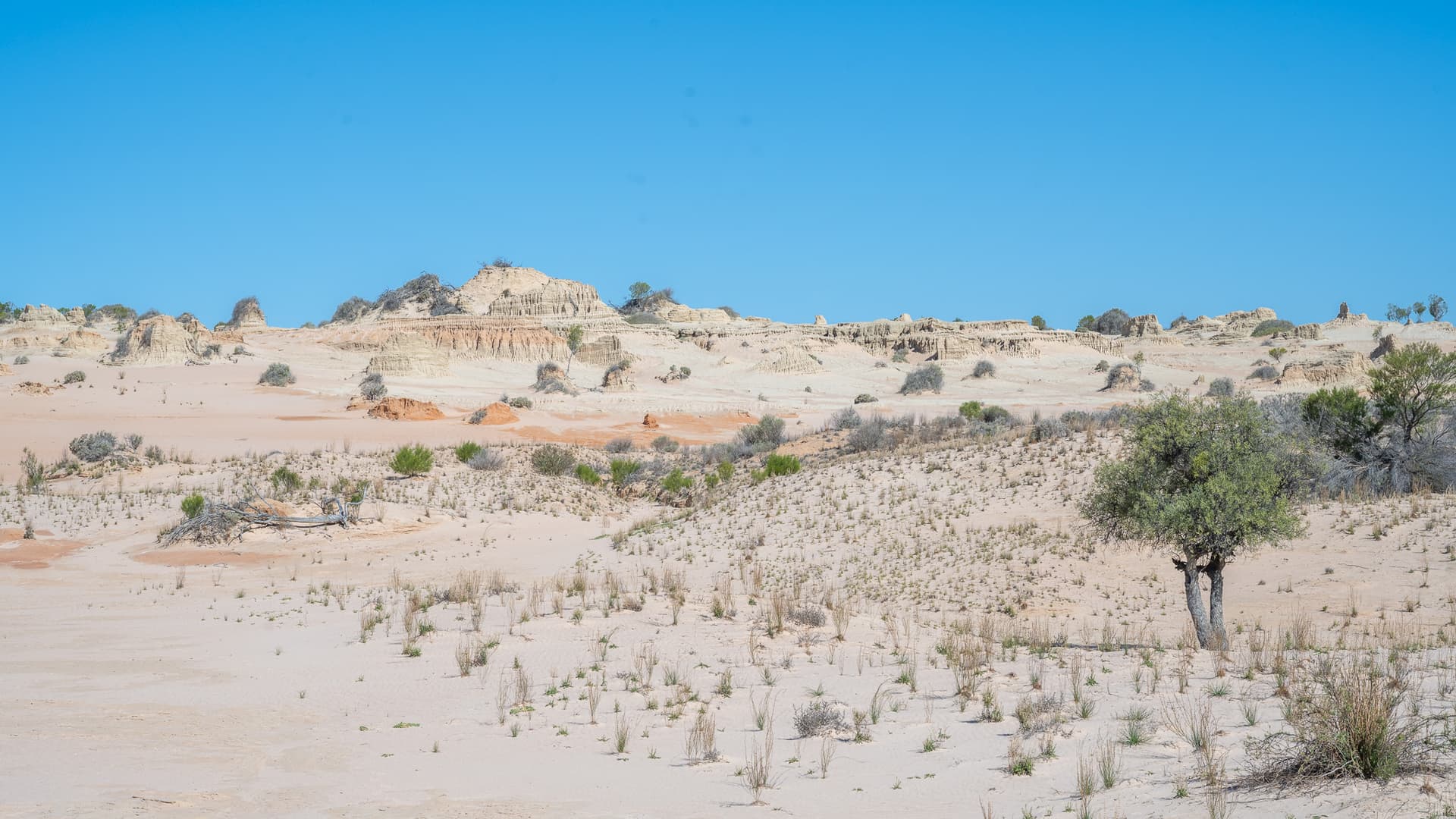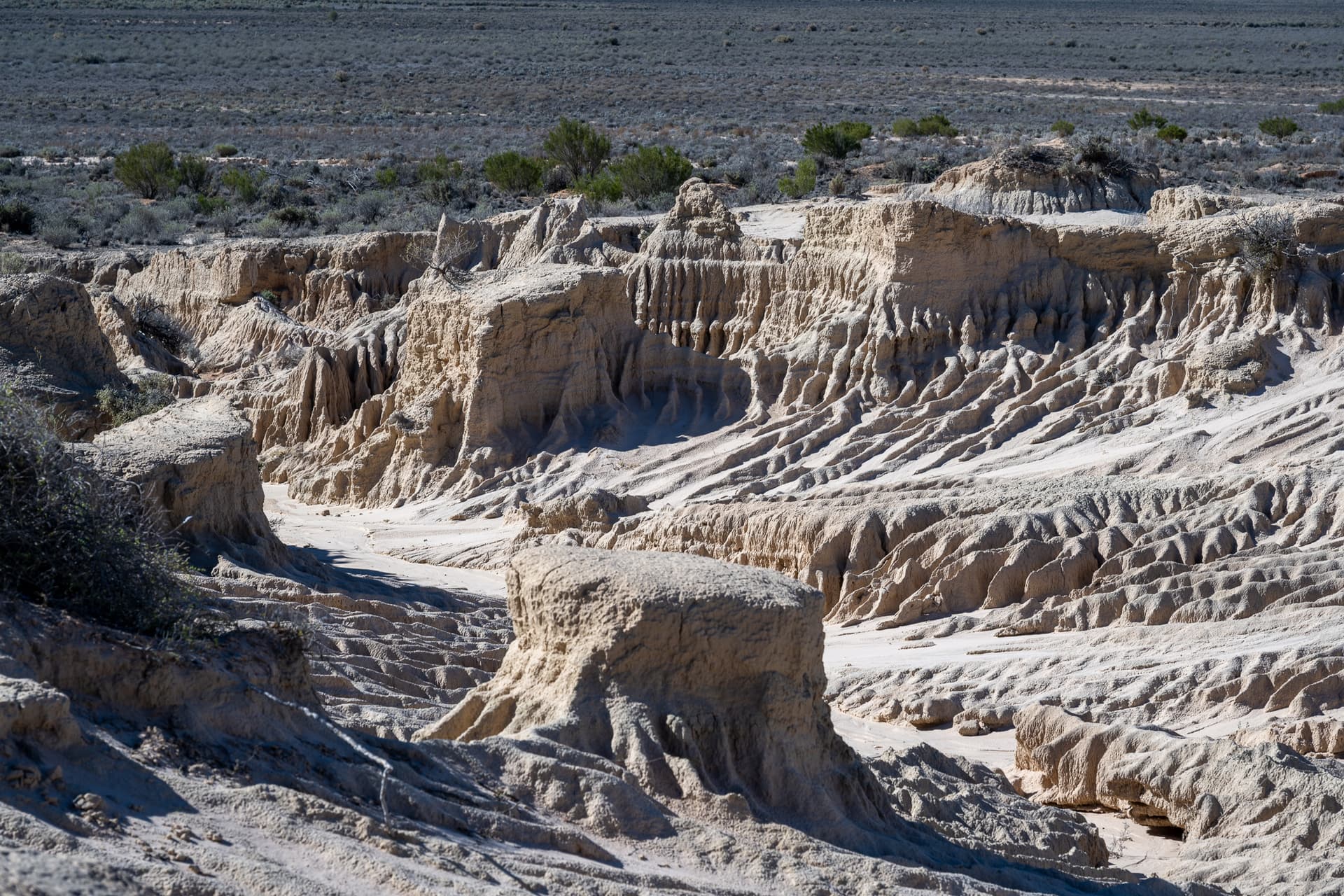 从墨尔本往北两个小时就进入了字面意义上的无人区,荒漠一望无际,公路直通天边,却看不到一辆对向来车。跨过州界来到新南威尔士公路交汇处的补给站的Balranald小镇,便是Mungo National Park之前最后的人烟——接下来的两个半小时,一望无际的荒原,飞沙走石的土路,尘沙滚滚的旋风,在公路边追着车跳跃的袋鼠,是刻板印象中末世澳洲的样子。