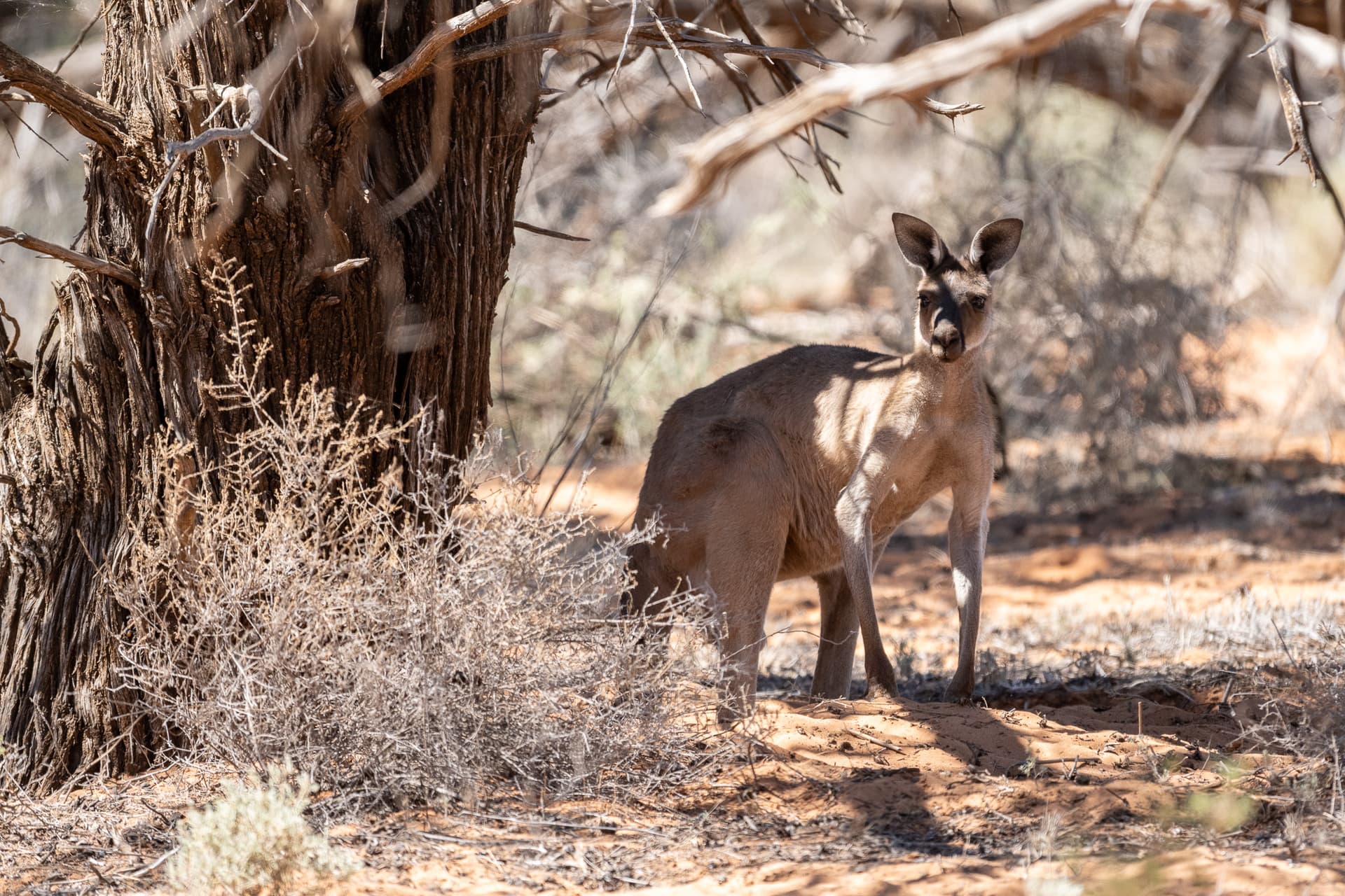 正是日落时分,光影非常柔和。此时一只西部灰袋鼠突然从眼前不到五米的地方跳过——显然没来得及换镜头于是没拍下来,但此情此景我们都不由得发出一声惊叫,仿佛走入了印象中的Outback——虽然严格意义上这里也不算吧。