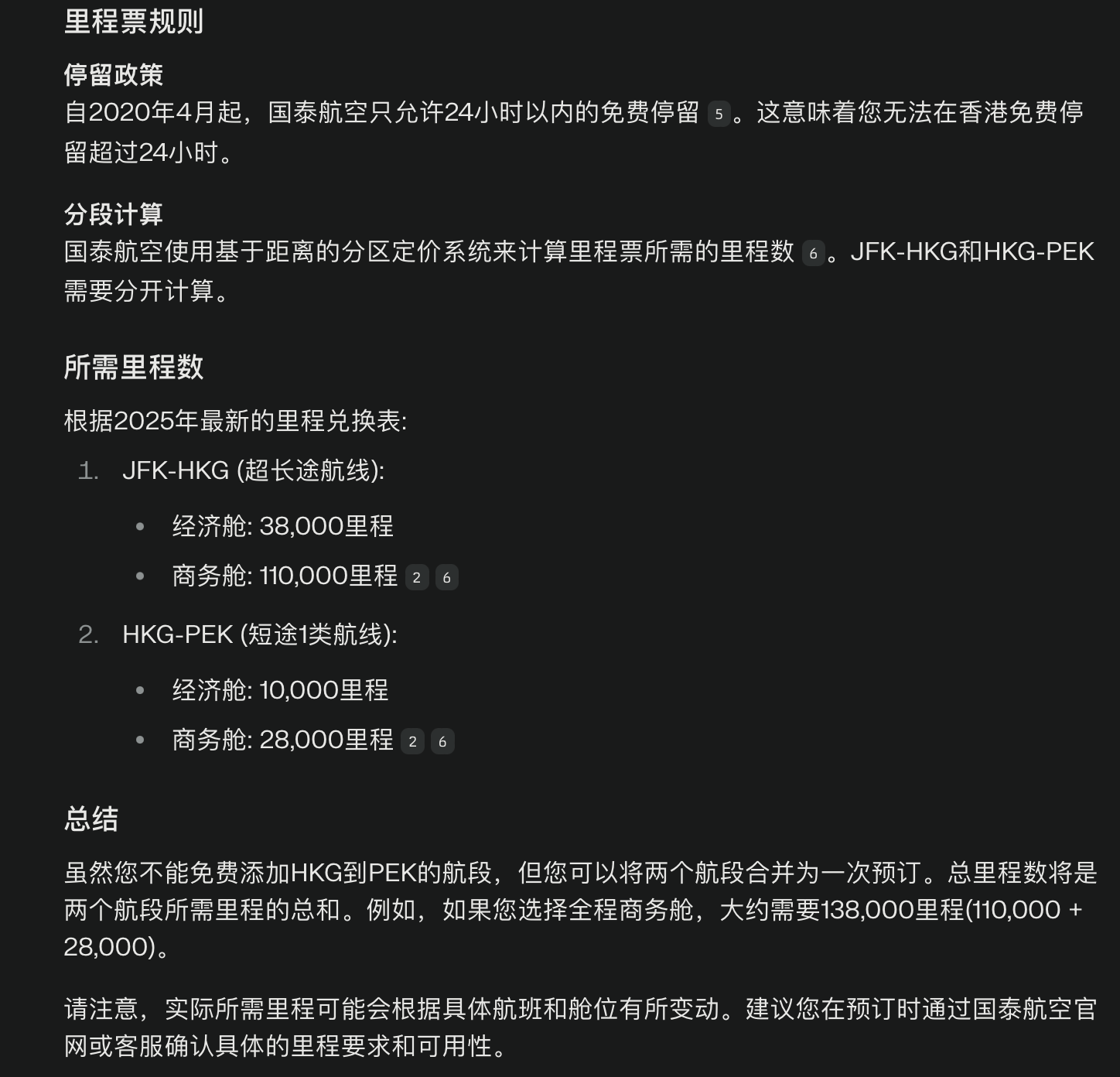 然后,国泰里程票最多转机1次, JFK - X - HKG,就搜索不到 HKG - PEK,应该要转机2次。