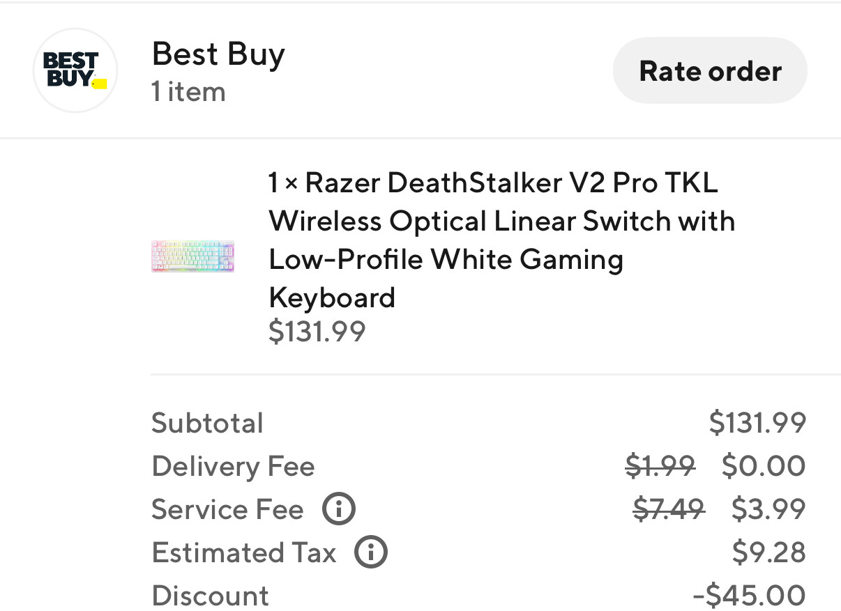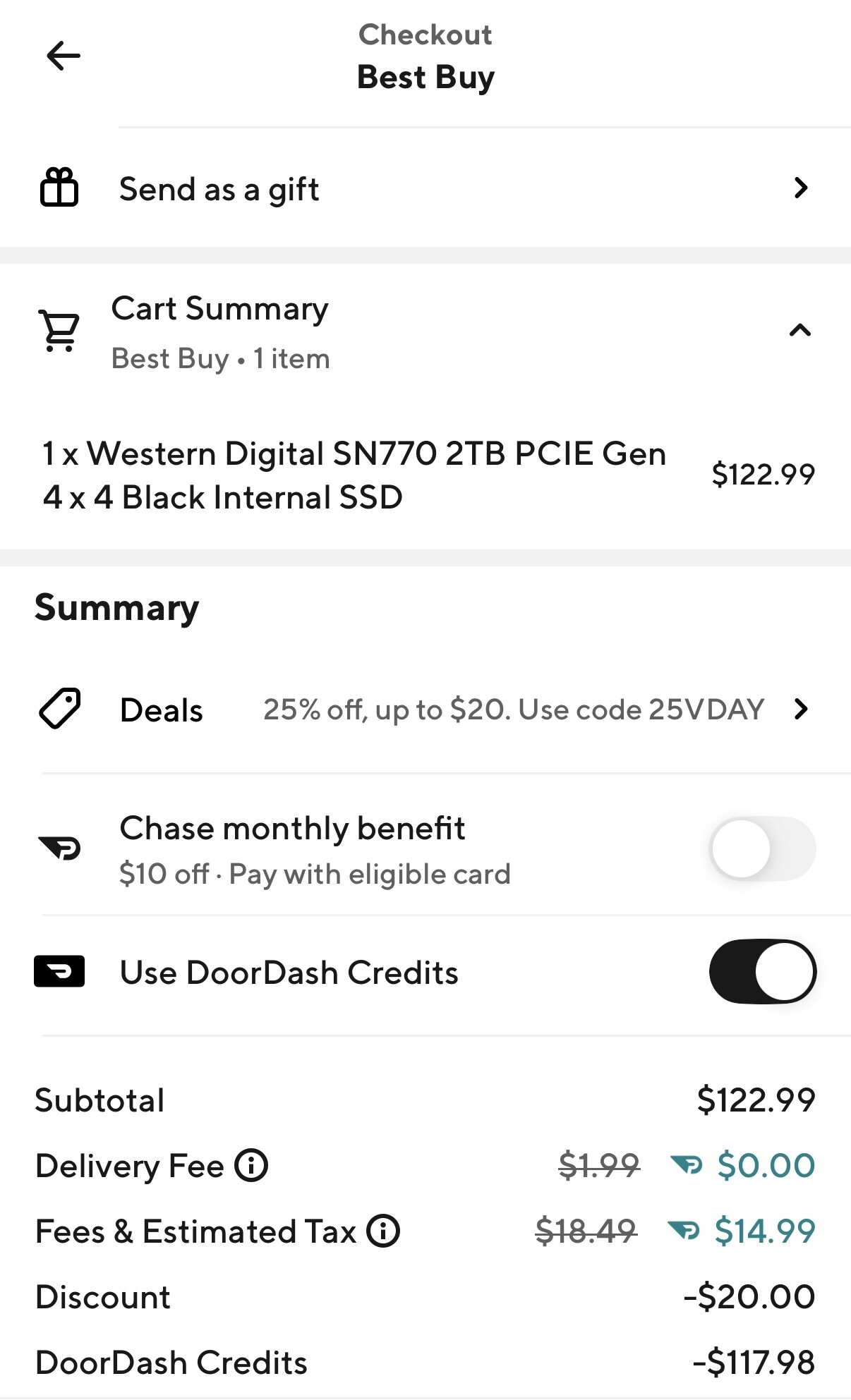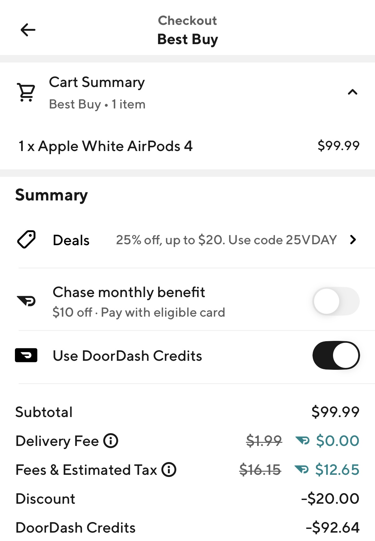 Doordash现在有个用在retails上的25VDAY的优惠码可以最高减20块钱。因为Doordash和Bestbuy有合作在Bestbuy官网的折扣也会在Doordash上有,所以叠加costco线下还能买到的8折Doordash礼品卡能凑到一些东西的史低。比如现在100刀的Airpods 4丐版和123刀的SN770。