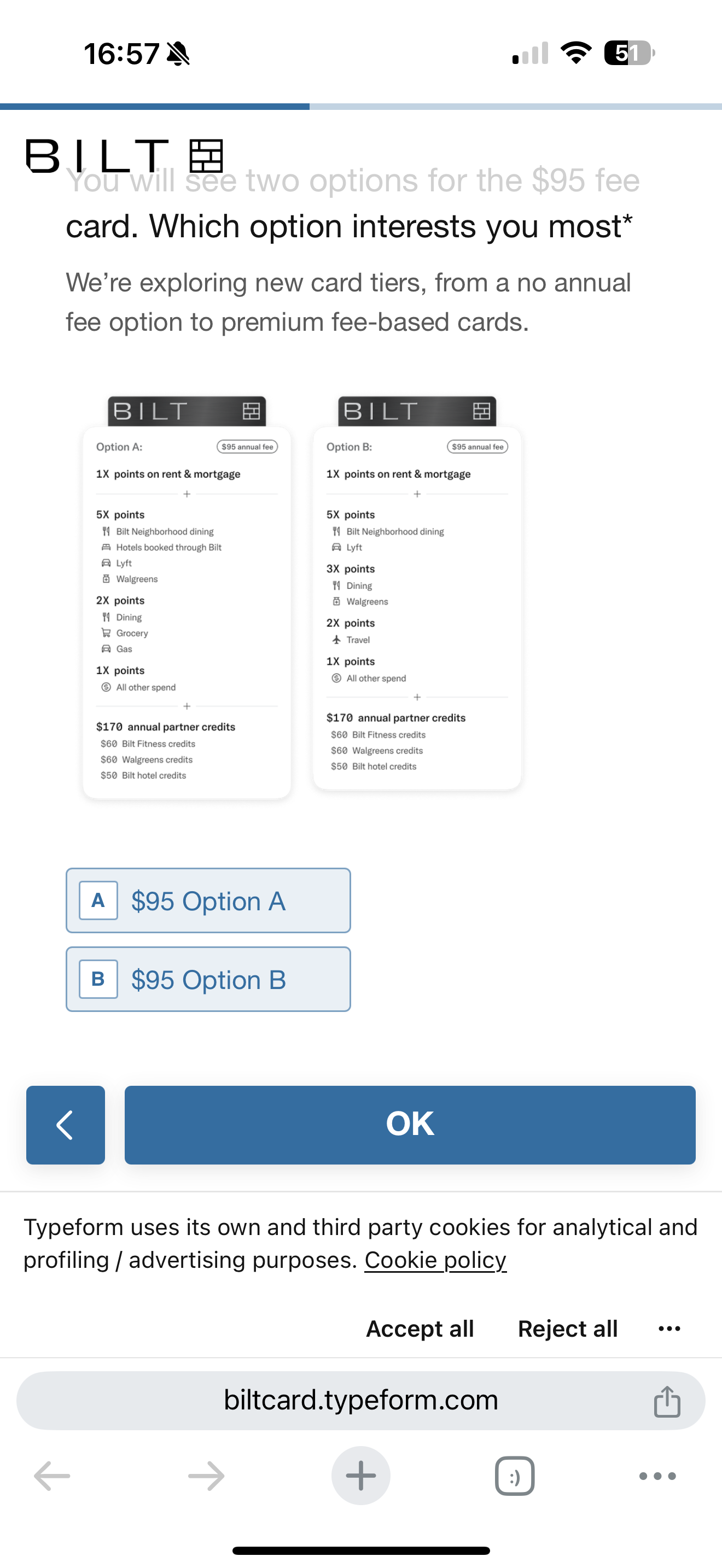 survey不让我哪个也不选 最后选了a 好歹4x机票 5x lyft(印象中chase那几张5x lyft也是限时合作来着 看了眼until March 2025) 然后5x bilt neighborhood dining限定饭卡用