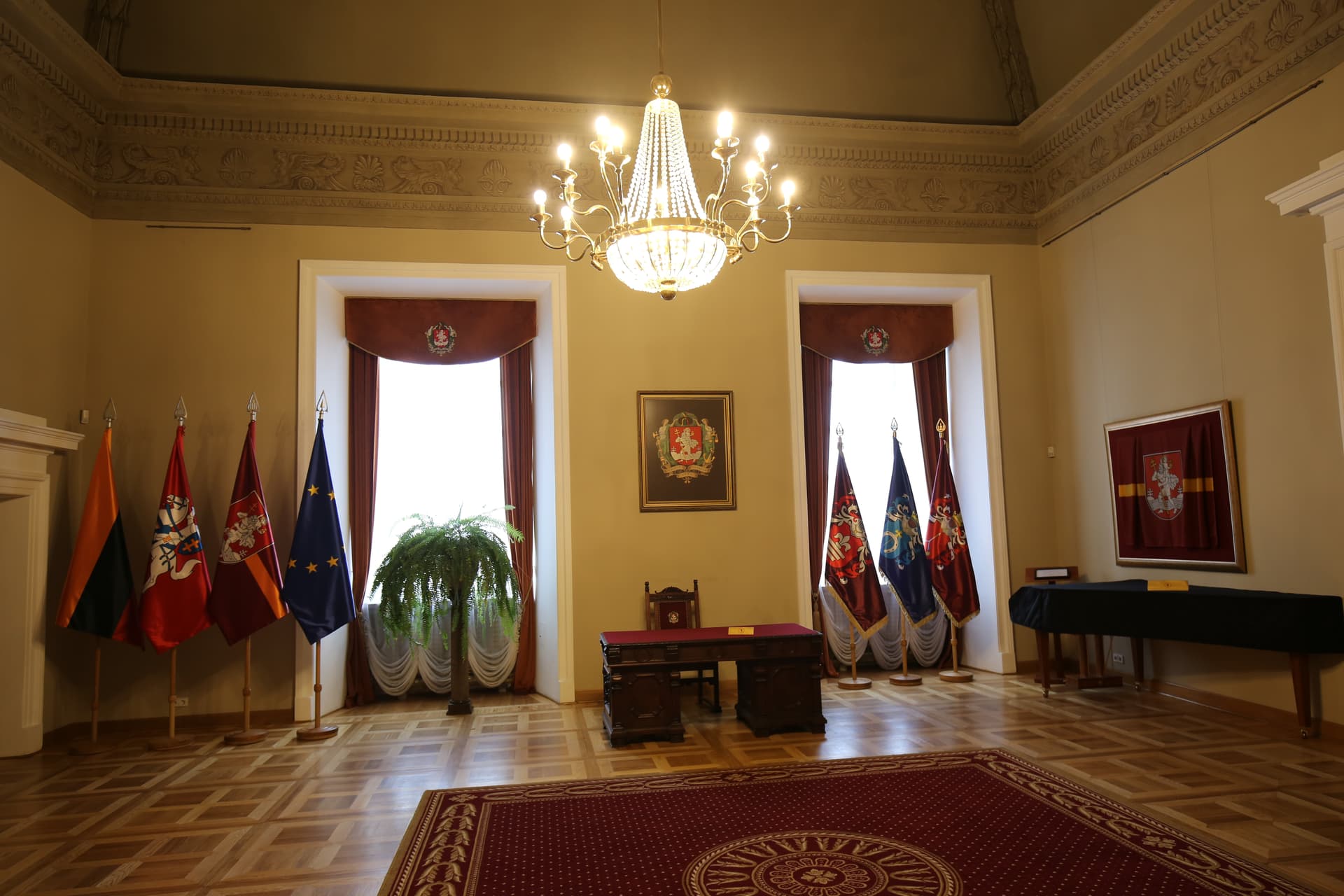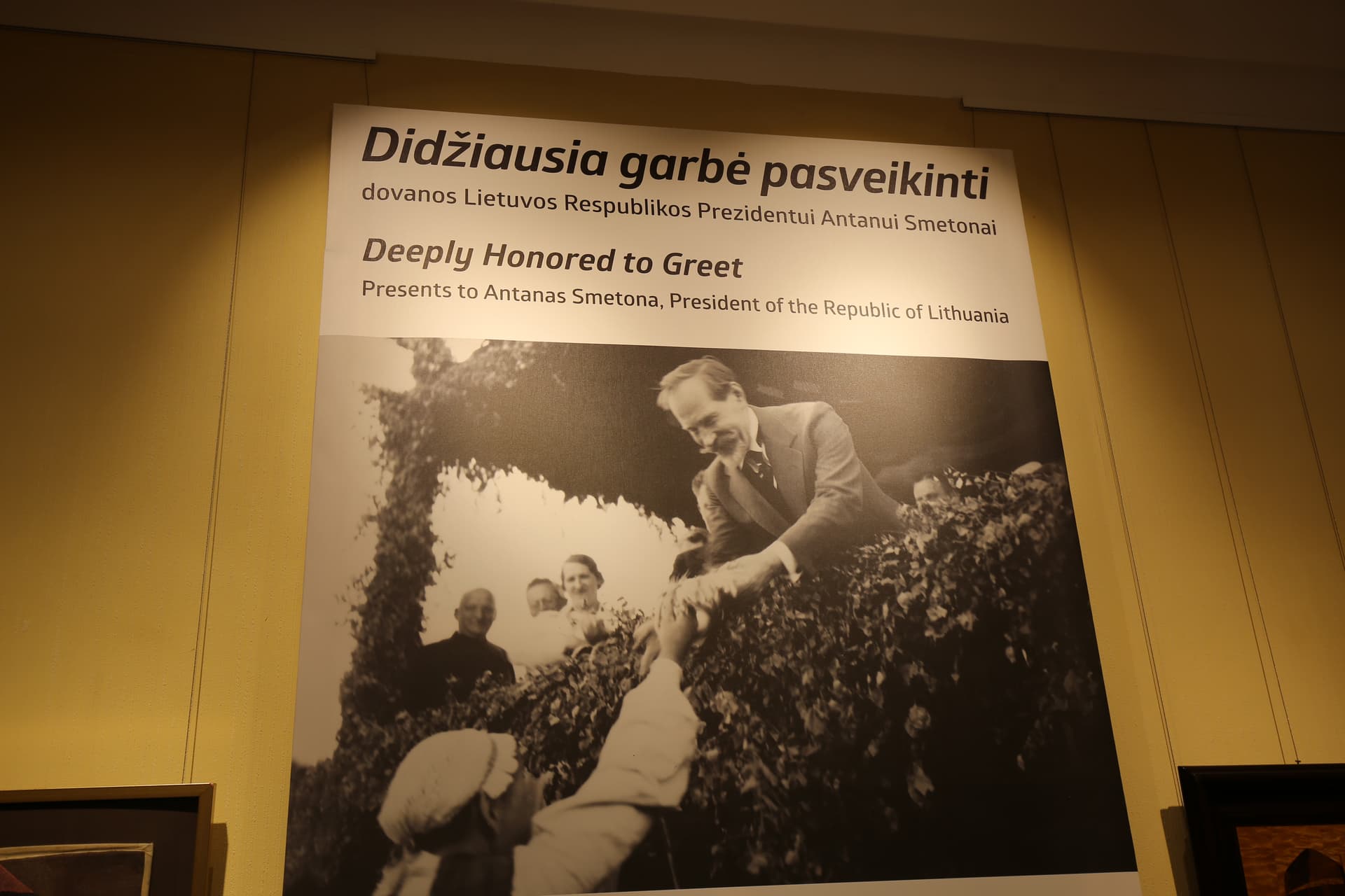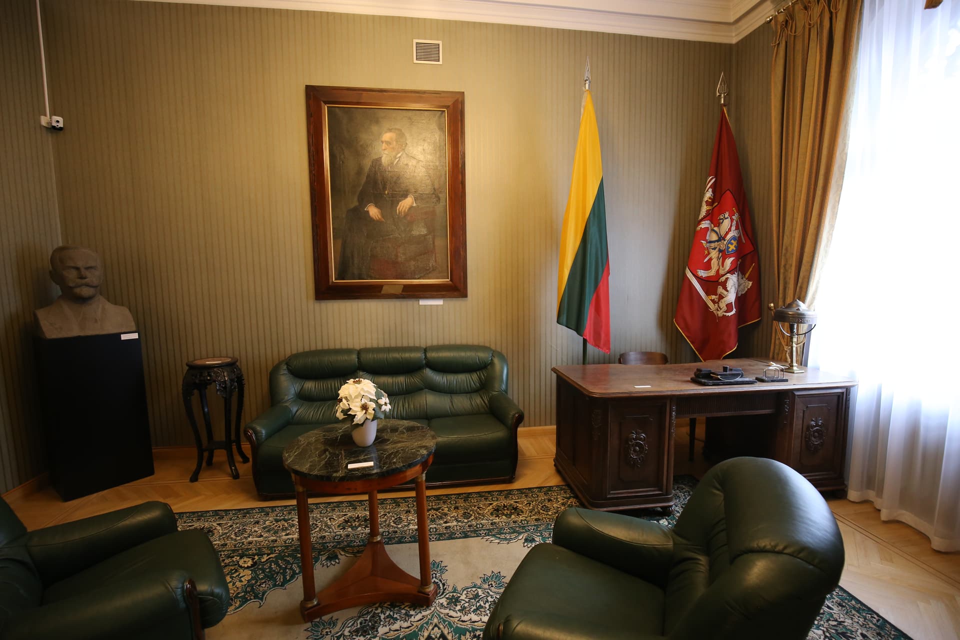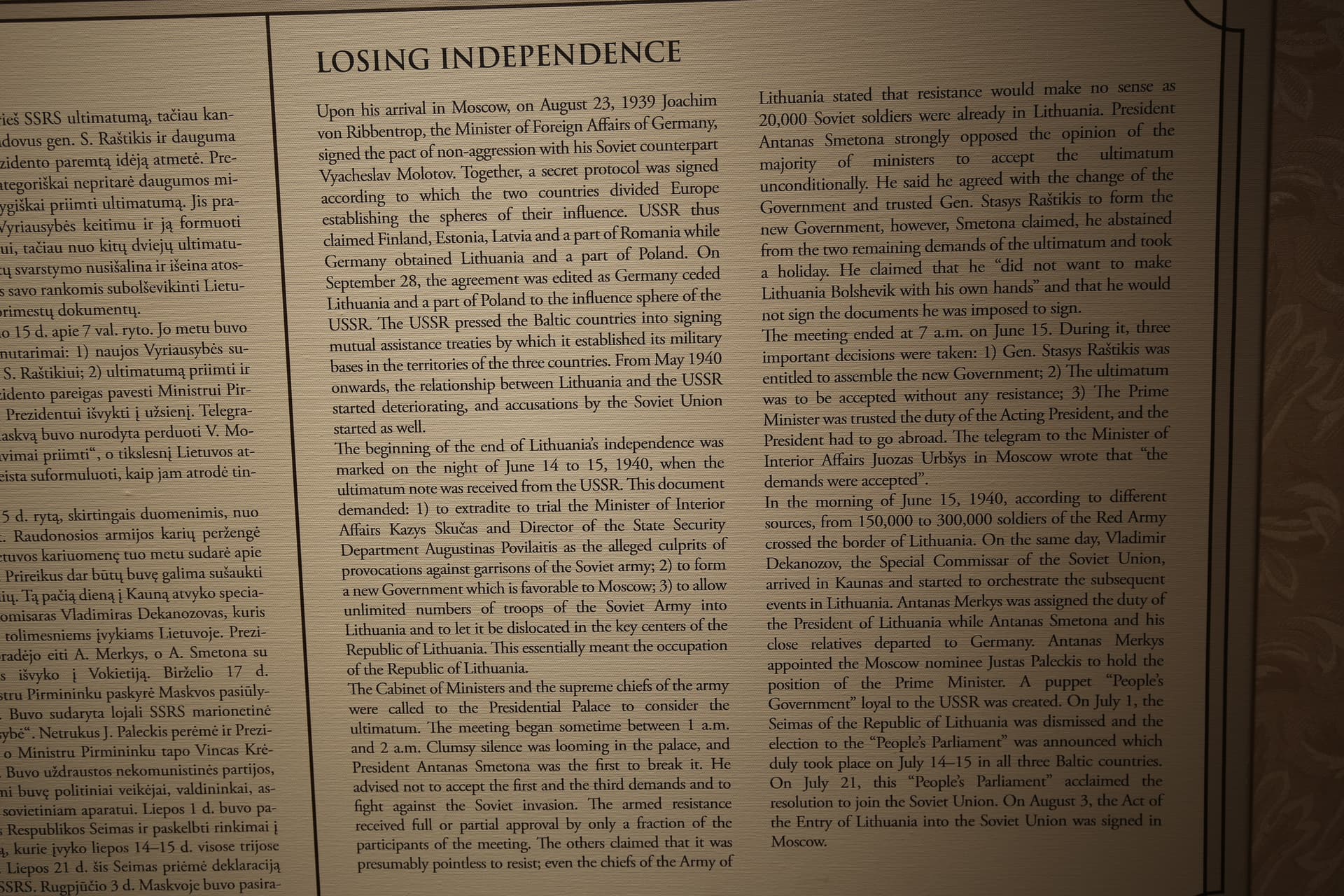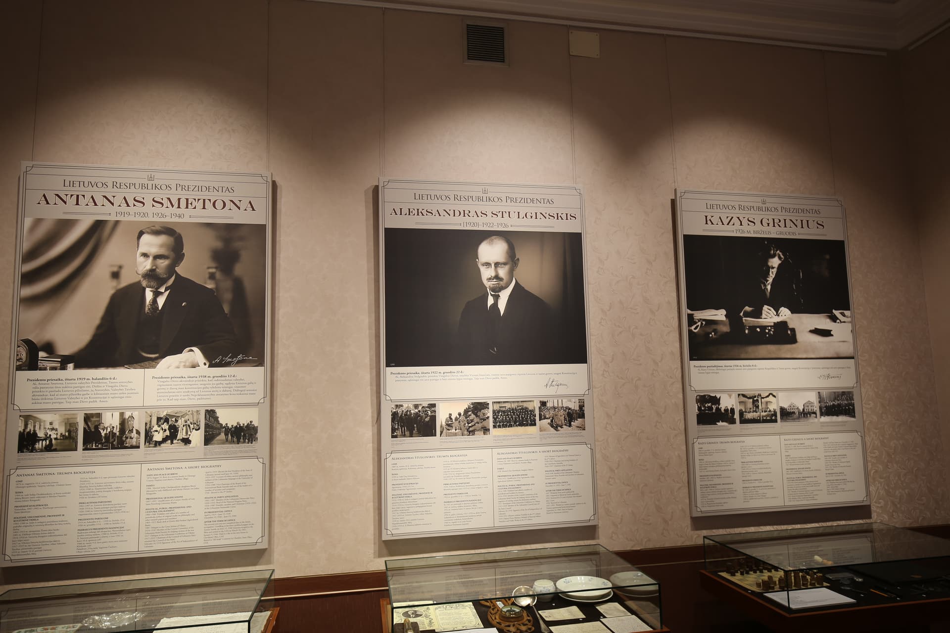 1918年立陶宛刚独立的时候,维尔纽斯被划为波兰领土。立陶宛无力夺取,只能把考纳斯设为首都,把当年沙俄的总督府改成总统府。在两战之间的20年时间里,立陶宛有三任总统住这里。第三任总统因为任期长,还有特别展览。印象比较深的是1940年,苏德瓜分波兰的大环境下,尝试组织抵抗苏联,但是政府内阁官员也深知小国无法抵抗大国,总统无奈之下交出政权给总理并出逃,但是拒绝签署亡国条款。