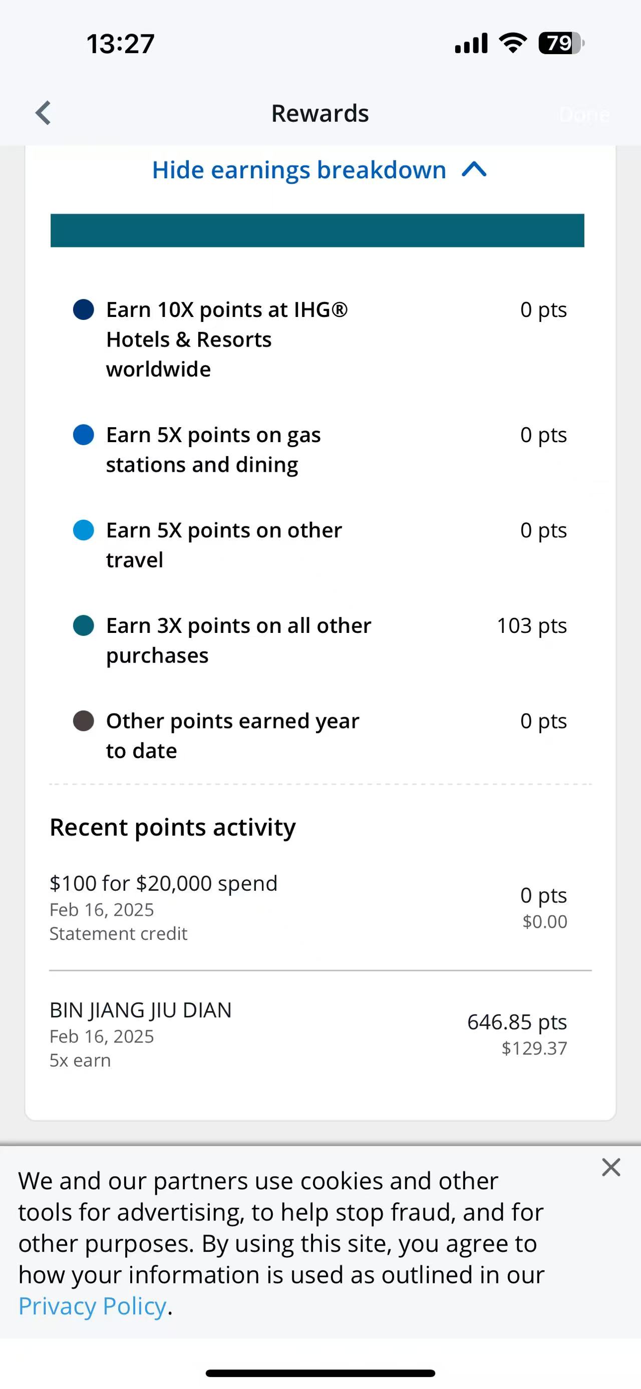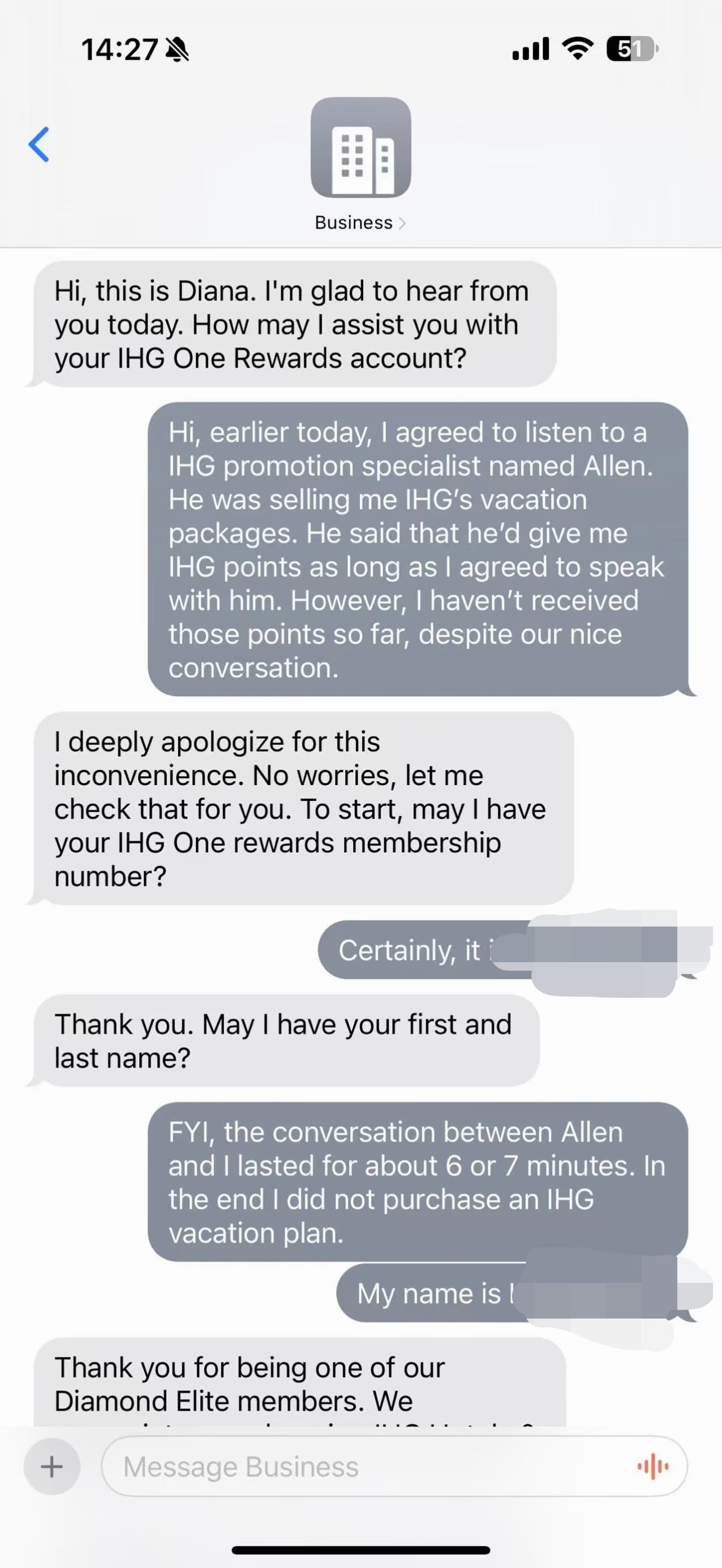 打电话给Chase,Chase整了几分钟,说系统里找不到你住的这家 BIN JIANG JIU DIAN(“滨江酒店”)呢,没法给你调整5x至10x,你找IHG吧。我就又电话IHG,几分钟后,给我了3000点,又转我至听课房推销,说是再给500点,我说才500点呀,价值2.5刀,能不能加个零呀?他说you deserve it but that’s what I can offer。BS了一会儿我以他们没有夏威夷的听课房拒了。那salesman食言,没给我点数,我就又chat,最终还是拿到了。
