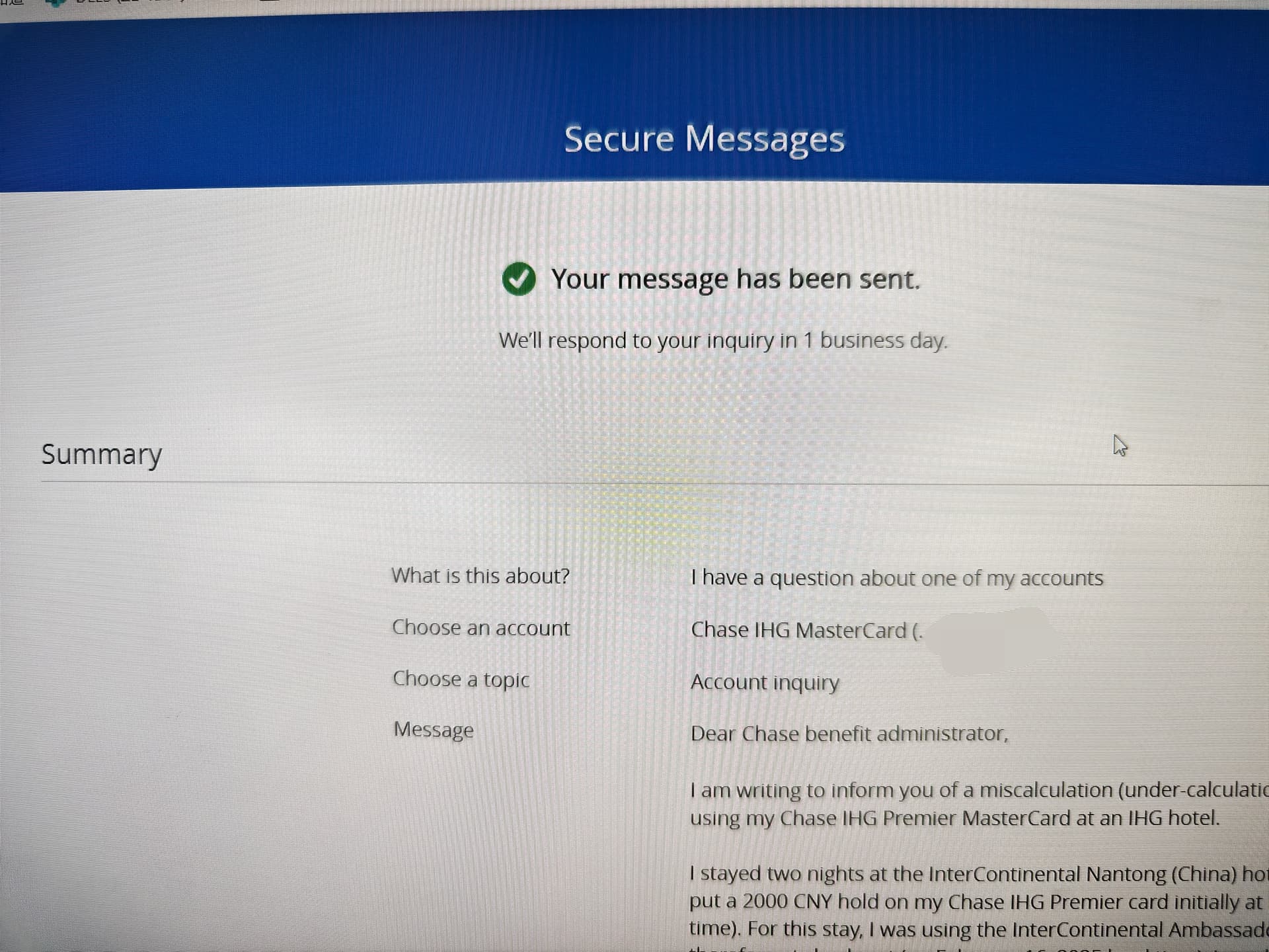 I am writing to inform you of a miscalculation (under-calculation) by Chase of my IHG Reward points by using my Chase IHG Premier MasterCard at an IHG hotel.
