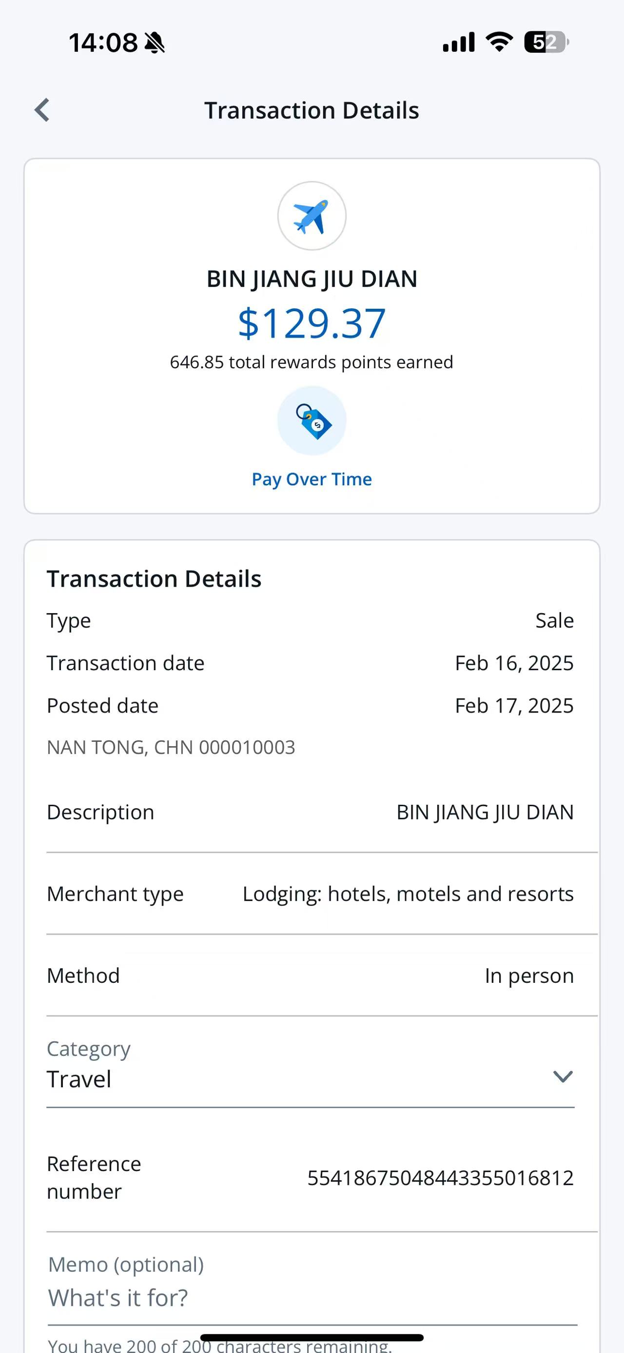 Now, looking at my Chase IHG Premier card's account page on Chase.com, Chase categorizes my spending at InterContinental Nantong as "Hotel" or "Other Travel", thus giving me 5x on my eligible spend there, see Photos 3 and 4. However, due to the fact that the hotel billed my Chase IHG Premier card as "BIN JING JIU DIAN", Chase's system does not realize that this hotel is an IHG hotel, therefore Chase should have given me 10x on my eligible spend over there.