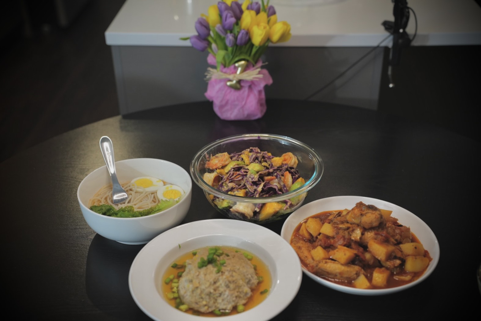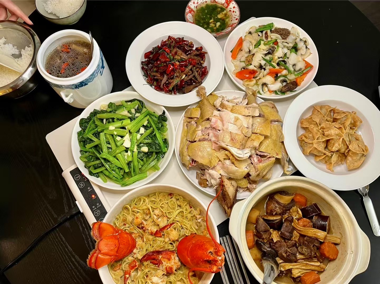 以下是她不同时期的年夜饭,招待朋友的大餐,宝宝周岁餐,平时早餐及自己发的面包。