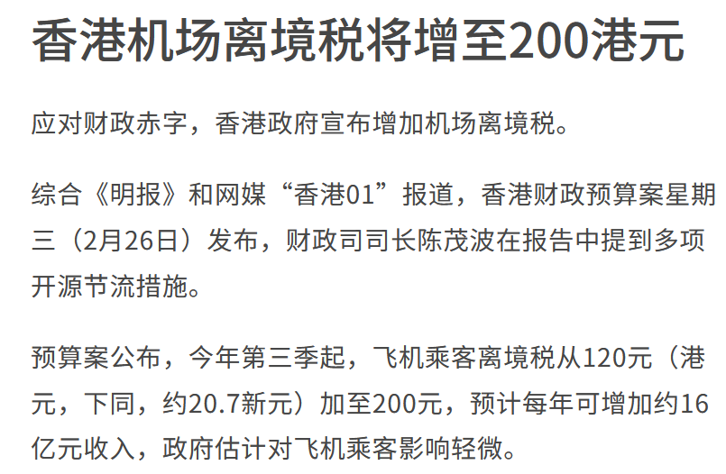 (一)由二零二五/二六年度第三季起,將飛機乘客離境稅由現時每位乘客一百二十元增加至二百元,預計每年可增加約十六億元收入。估計對飛機乘客影響輕微;