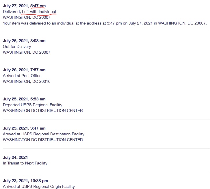 显示投递和收到这可是两回事啊。以usps的历史和我的tracking信息我无法不担心啊,你看我本来应该26号投递,一大早就扫码了,按我经验business address一般都是上午投递吧,然后一整天不知道哪去了,直到第二天晚上大使馆都关门了才再次扫码显示投递,居然还是投递给了个人?!加上快三周了状态没更新这让我不得不心里犯嘀咕啊!