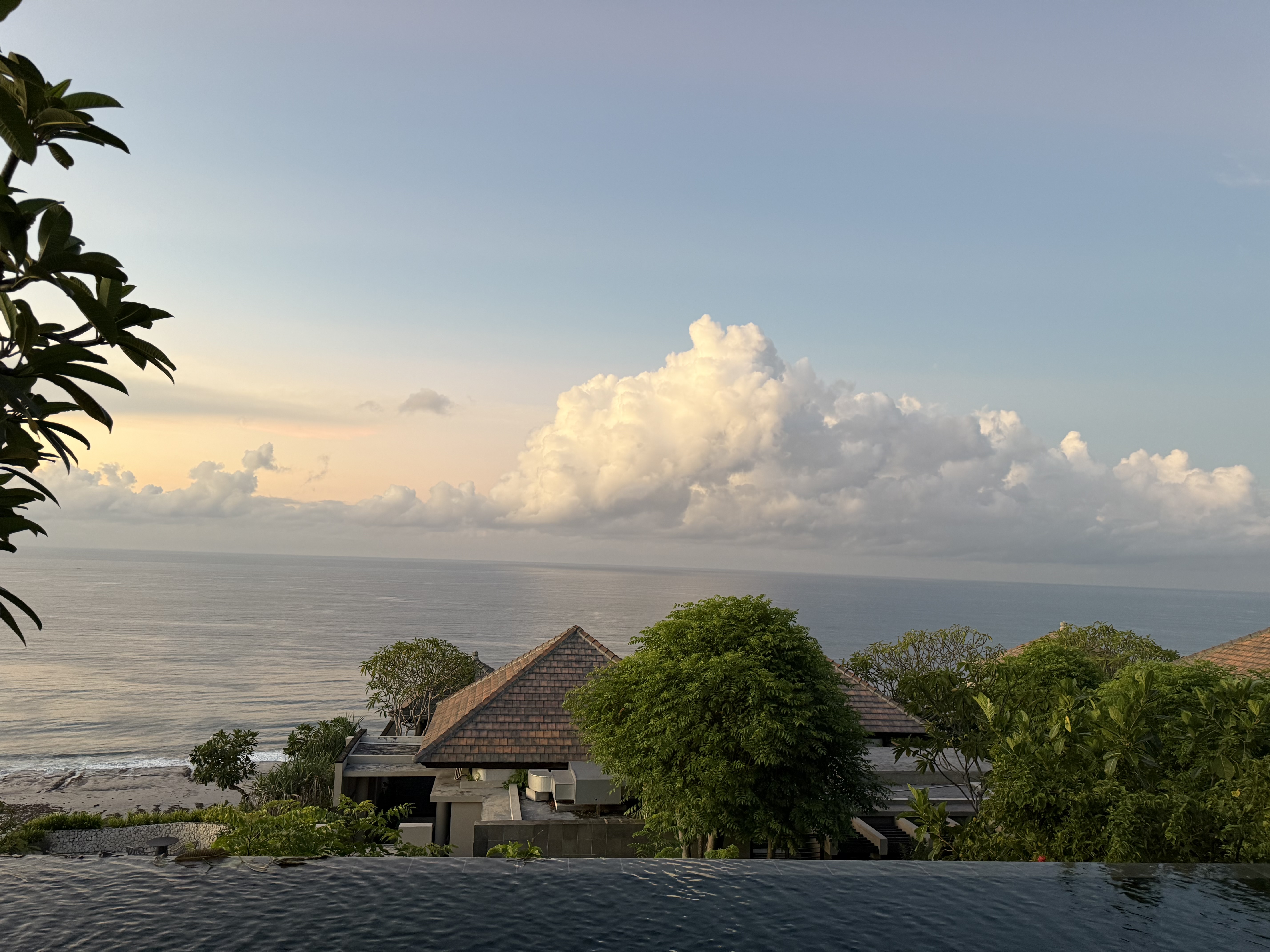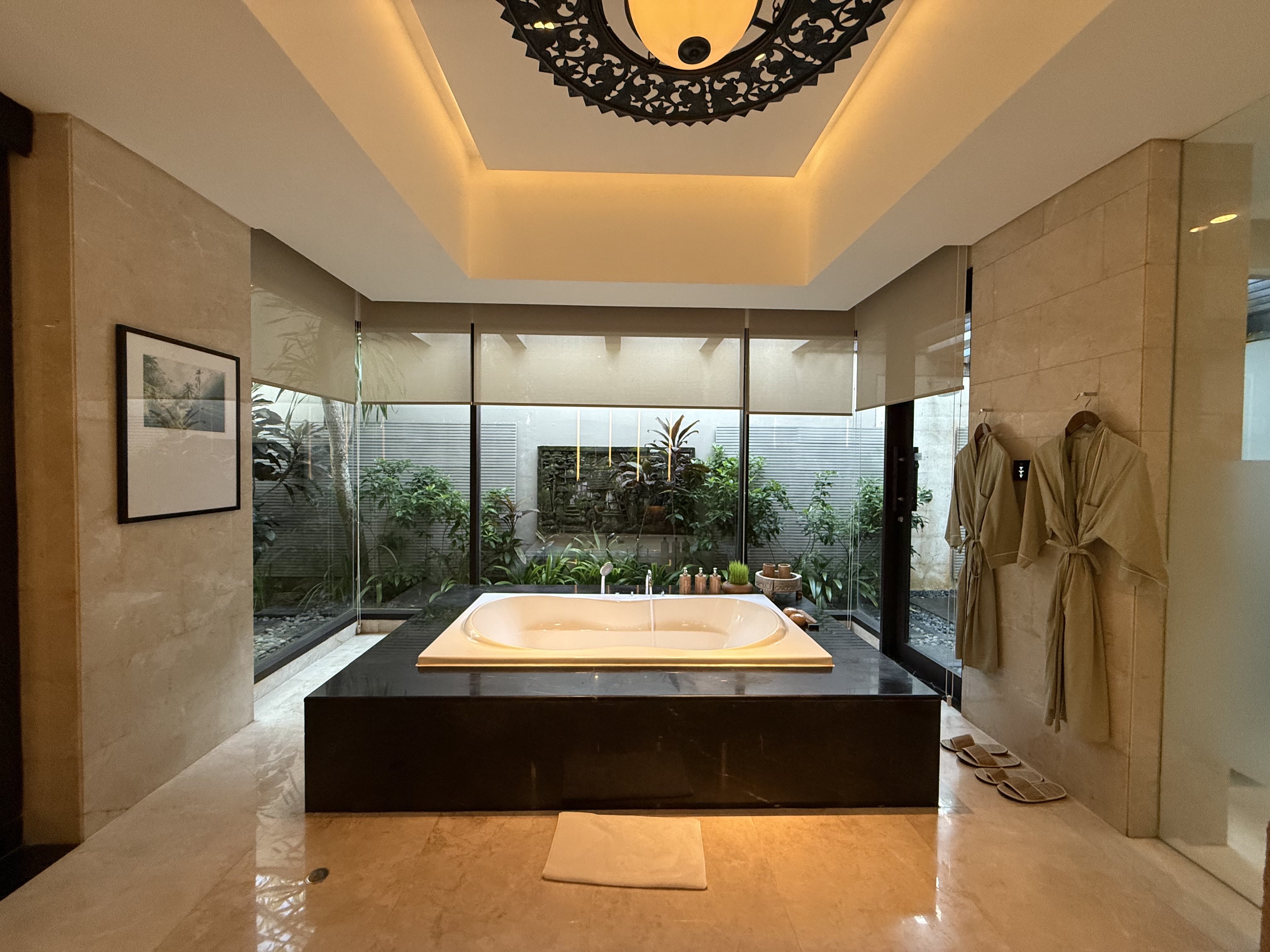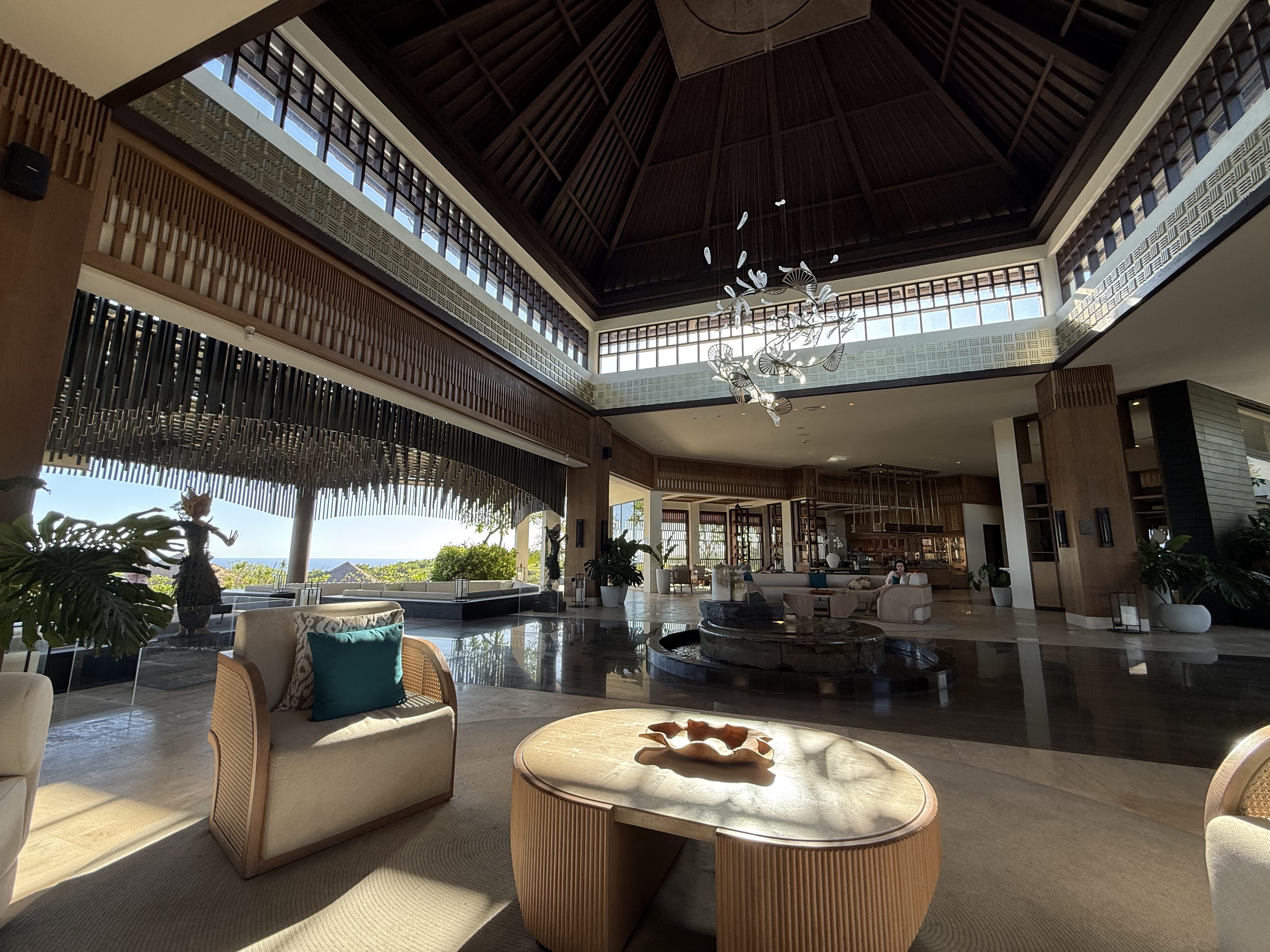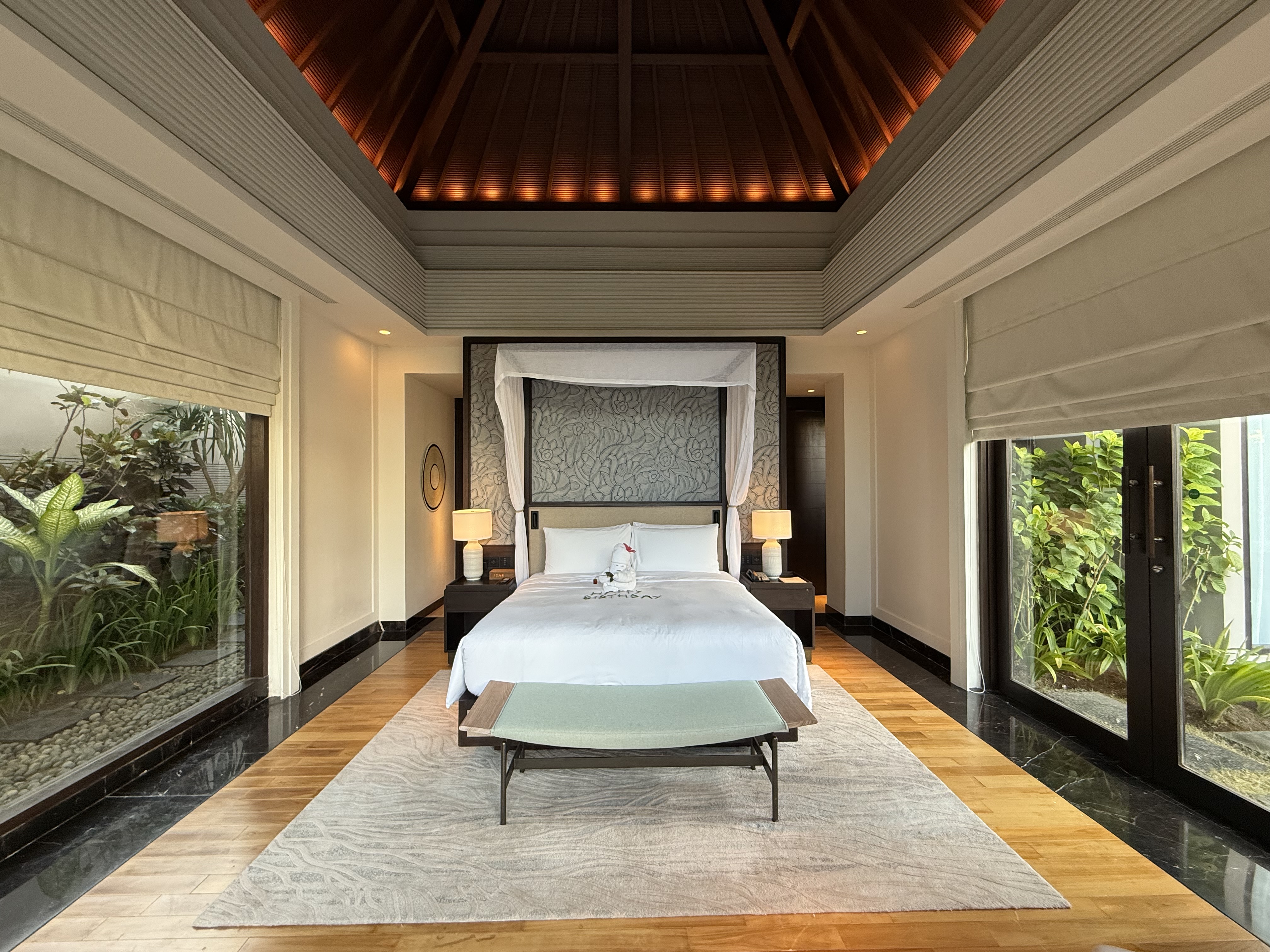 房间用积分定的两晚。落地之后打车刚ci,因为lz想从garden view升级到ocean view, 但小哥说升一级的partial view没有了,正海景也sold out了,只有panoramic ocean view了,本来offer的价格是5.8M,谈到了5.5M IDR(早知道多砍点了 也就便宜了100人民币左右),然后小哥带我去看了看房间。最后一间全景房了,在“二层”(高处),海景会被底下的房顶挡着一些。lz觉得可以接受,就还是要了。毕竟 @Srandy 强烈推荐升级到海景【酒店简评】Umana Bali, LXR Hotels & Resorts
