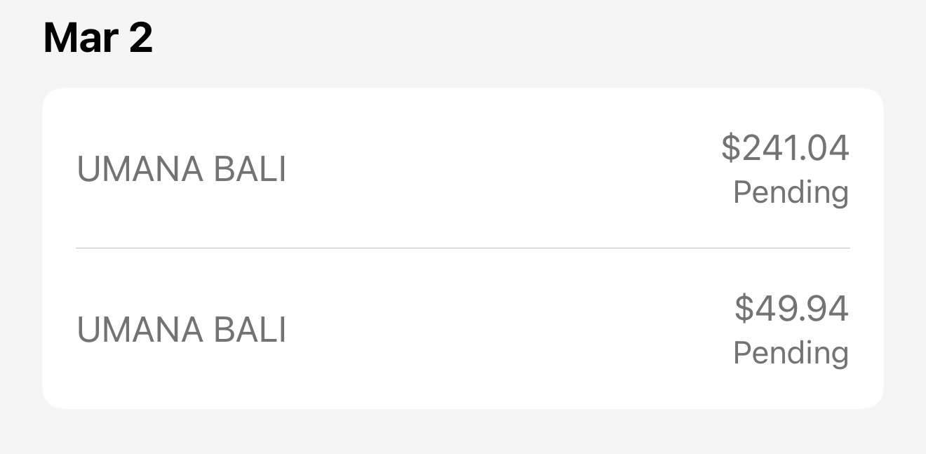 然后回到大厅付款,(露天的,是真的热),我先给小哥看我的Hilton gc,他拿过去问了其他人,他们说目前不接受。好,我说那我用Apple Pay付款,(事先把两张卡加到钱包里了),然后他就让用了哈哈哈。我说分开付,我就算了算汇率,顶着50美元付的,approval了,一共付了四次50美元,用了三张gc,一张surpass,剩下的131用的Biz Plat,应该还能报销50哈哈哈。