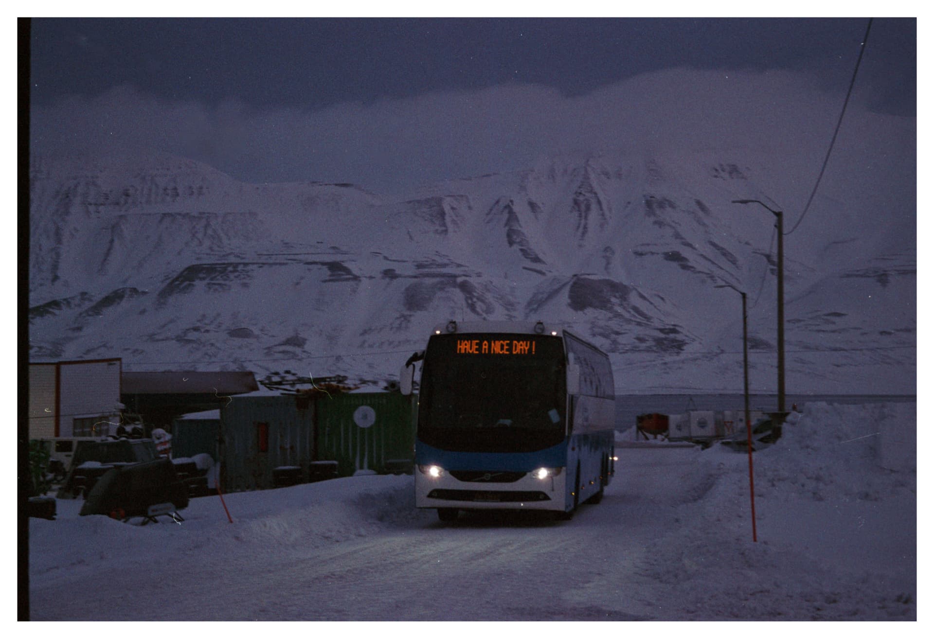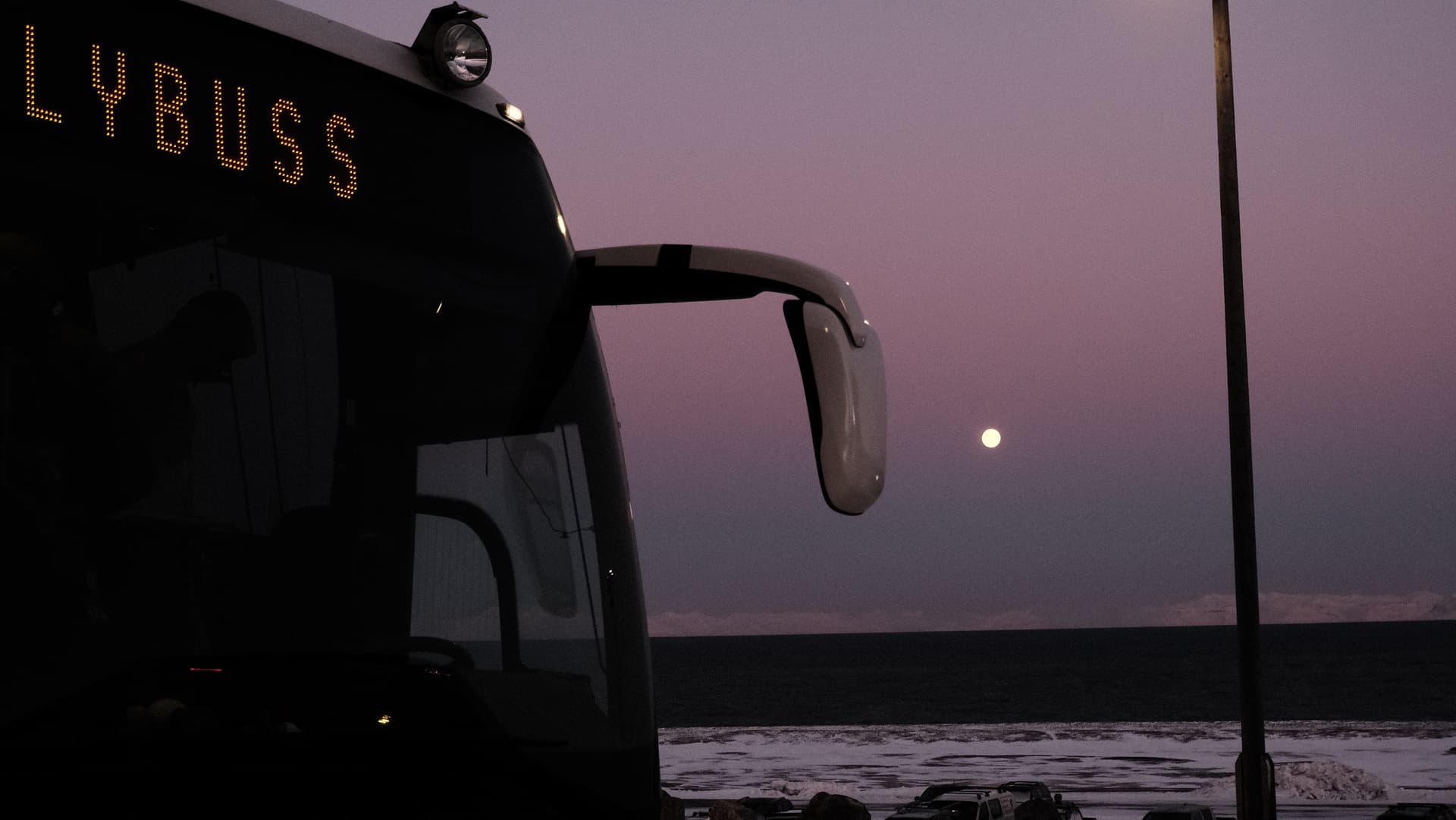 航班落地后会有巴士在航站楼外面等待。巴士时刻是按照当日航班时刻安排的,所以不用担心赶不上。单人票价110 NOK,上车付款。巴士会经过朗伊尔城的所有旅馆。在极夜里,高悬在天空上的其实是月亮。