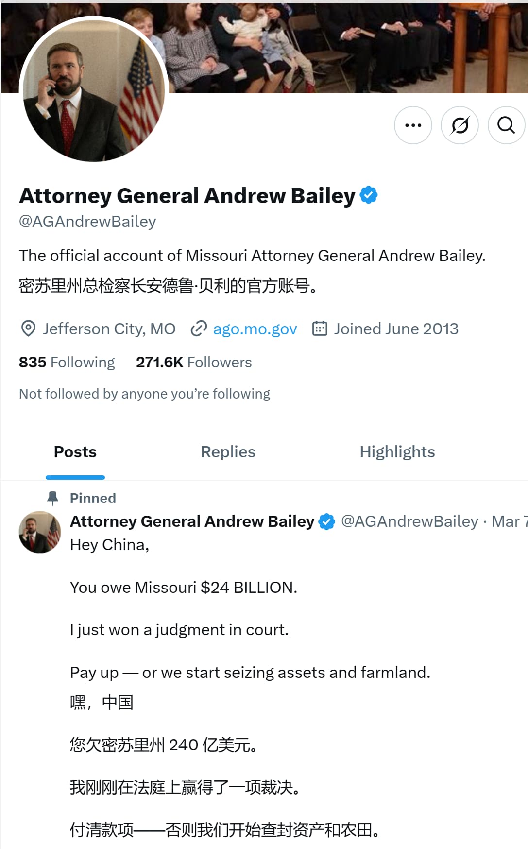 “China refused to show up to court, but that doesn’t mean they get away with causing untold suffering and economic devastation,” Bailey said. “We intend to collect every penny by seizing Chinese-owned assets, including Missouri farmland.”