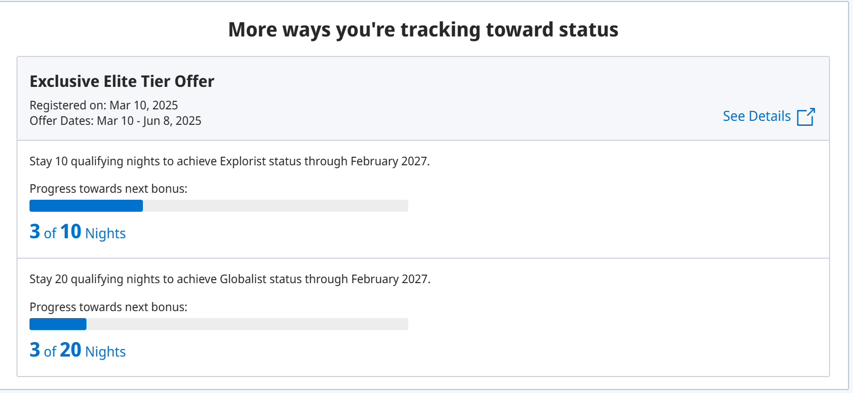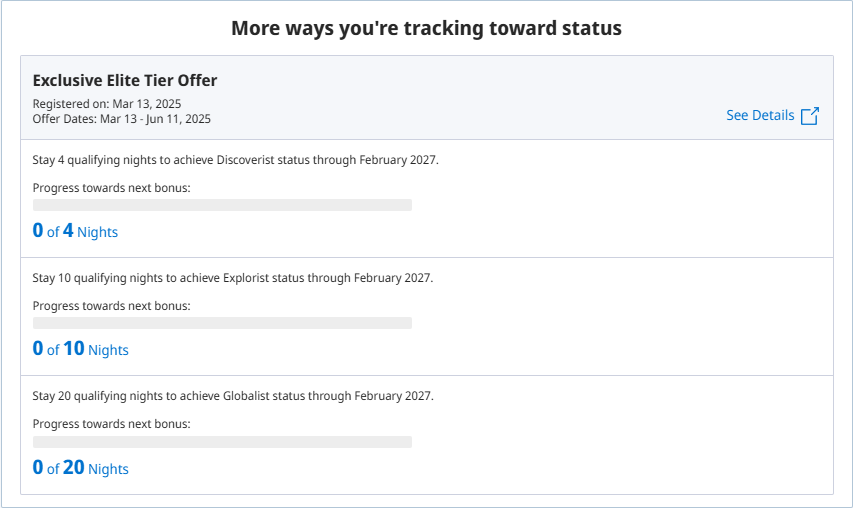 I have heard that Members registered into promotion will have 90 days after registration to complete the Tier challenge. During the trial period, stay 4 eligible nights to achieve DISV, 10 eligible nights/EXPL, and 20 eligible nights/GLOB. Members may choose points or miles for their stays