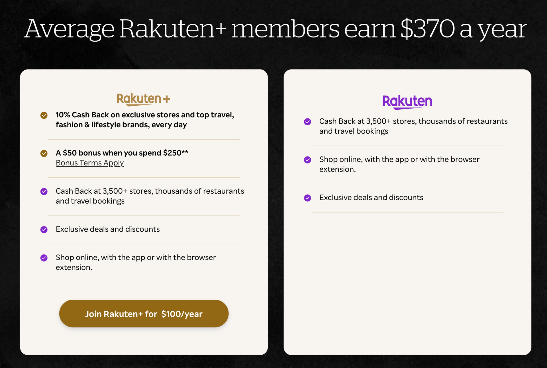 Offer may be modified at anytime. Only new members of Rakuten+ are eligible, unless you are an existing member of Rakuten who joined with a complimentary one-year subscription to Rakuten+. One Rakuten+ Bonus per eligible new member to Rakuten+. Qualify for the Rakuten+ Bonus of $50 when you sign up as a new member to Rakuten+, meet the eligibility criteria, and make Qualifying Purchase(s) totaling at least $250 within 90 days of starting your Rakuten+ subscription. A “Qualifying Purchase” means a purchase that earns Cash Back through Rakuten+ Merchant(s). Rakuten+ Bonus will be added to your next Rakuten+ Cash Back payment.