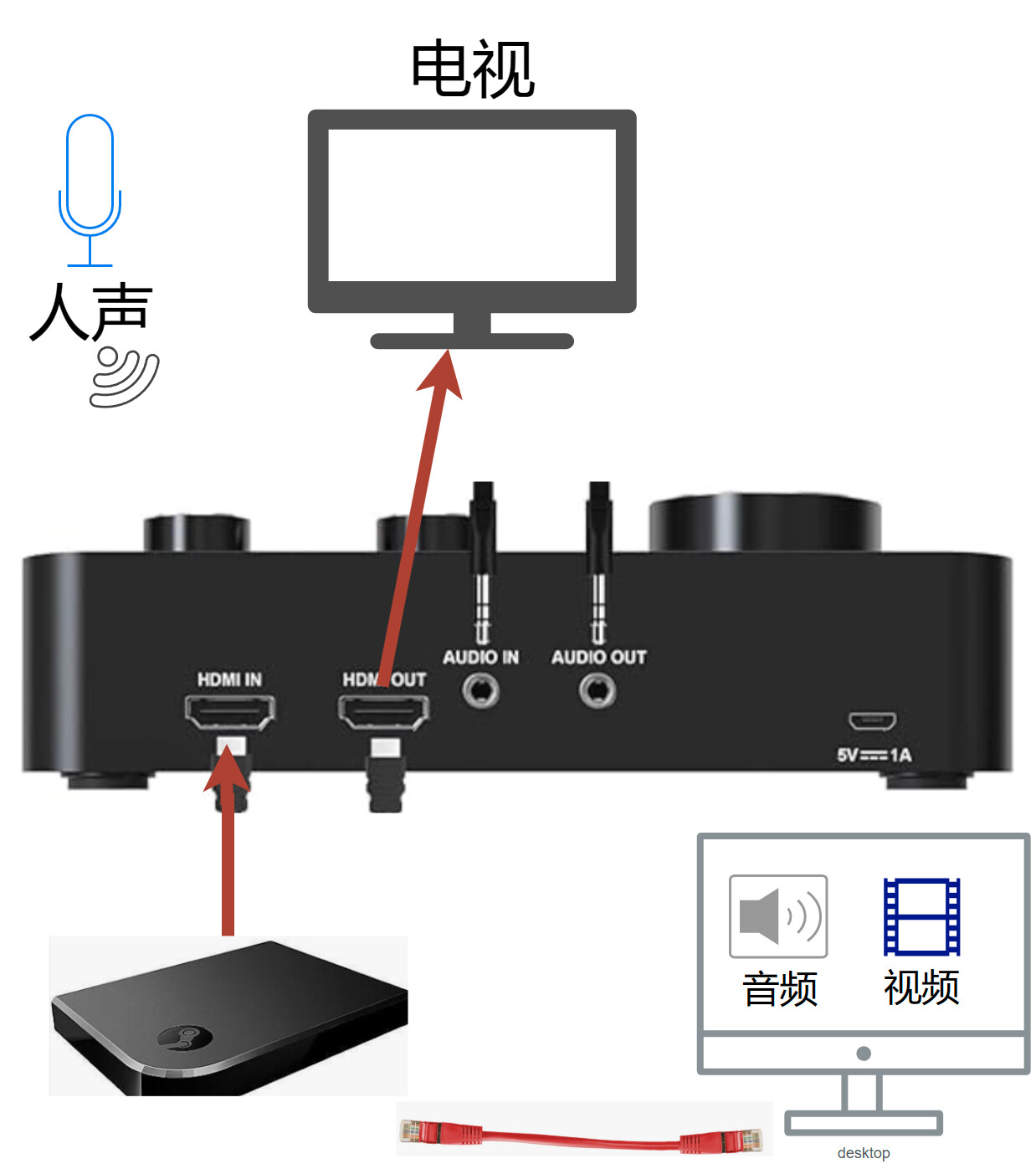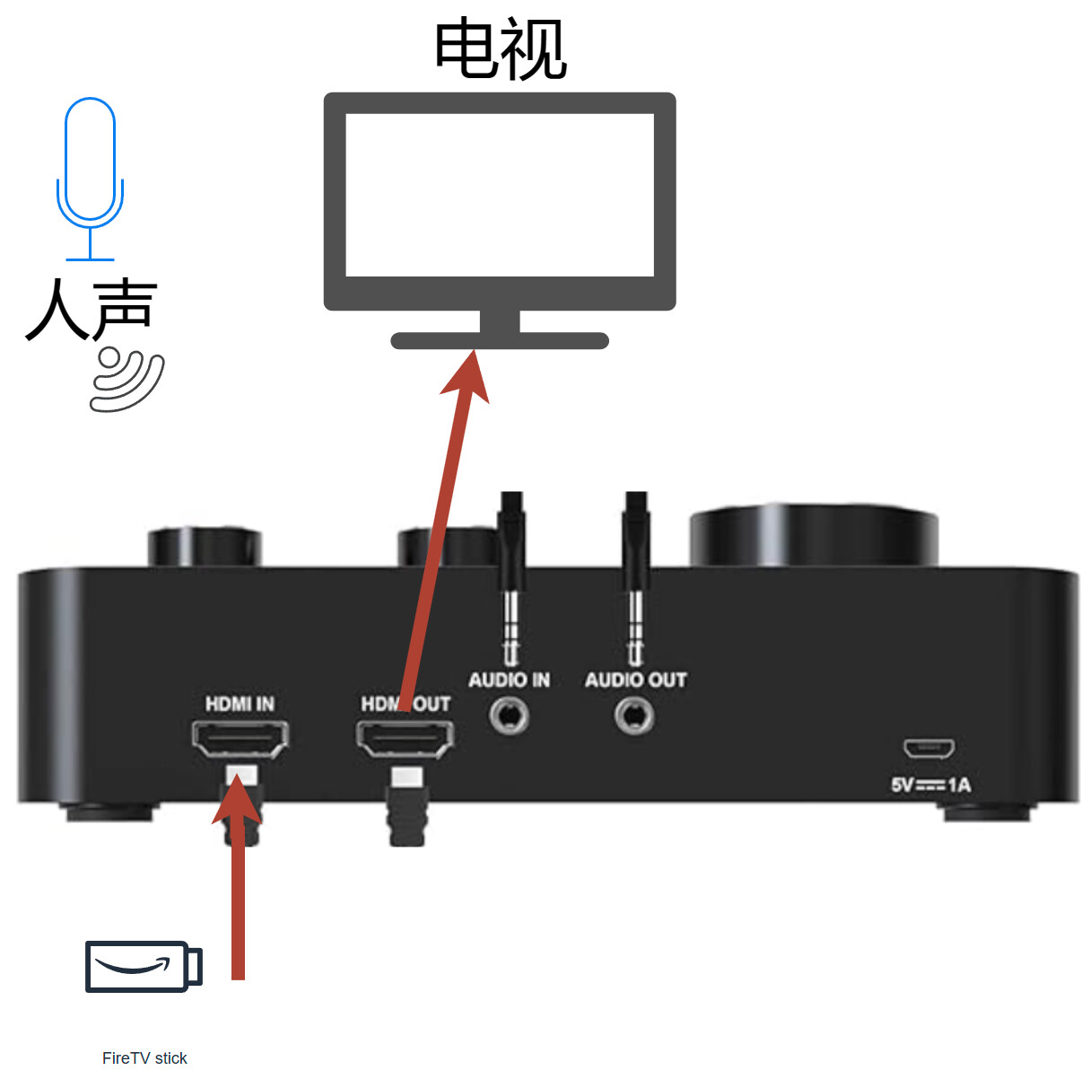 - 电视棒+混音器。前两种结构都要把电脑搬到客厅,是个很大的缺陷。最简单的解决方案是把输入端从电脑换成一个小巧的设备,比如firetv,apple tv,chrome tv,roku tv等等。显然这些电视棒是不具有混音能力的,人家压根就没有音频端口。所以我们依然需要之前提到的麦克风混音器。下面给出连接图示,其实就是把电脑换成电视棒直接插在hdmi in的接口上。