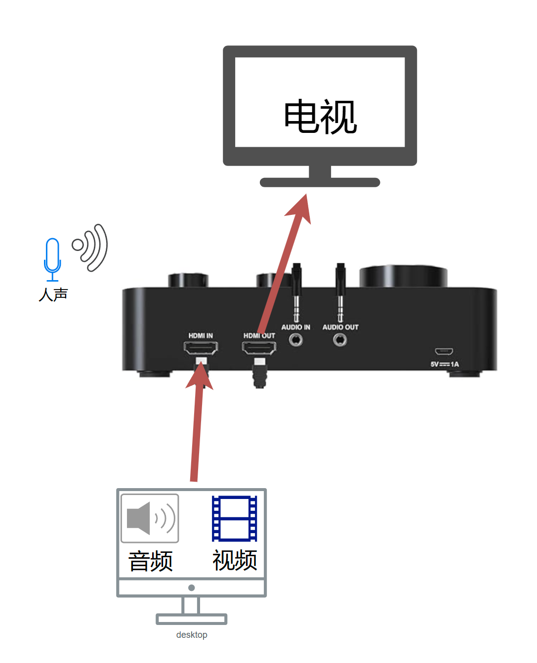 HDMI in接电脑,HDMI out接电视,电视另一个头HDMI ARC到soundbar。无论是混音器自带的麦还是外接的走AUDIO IN的麦都不行。我估计应该是这几次hdmi数模转换出了问题