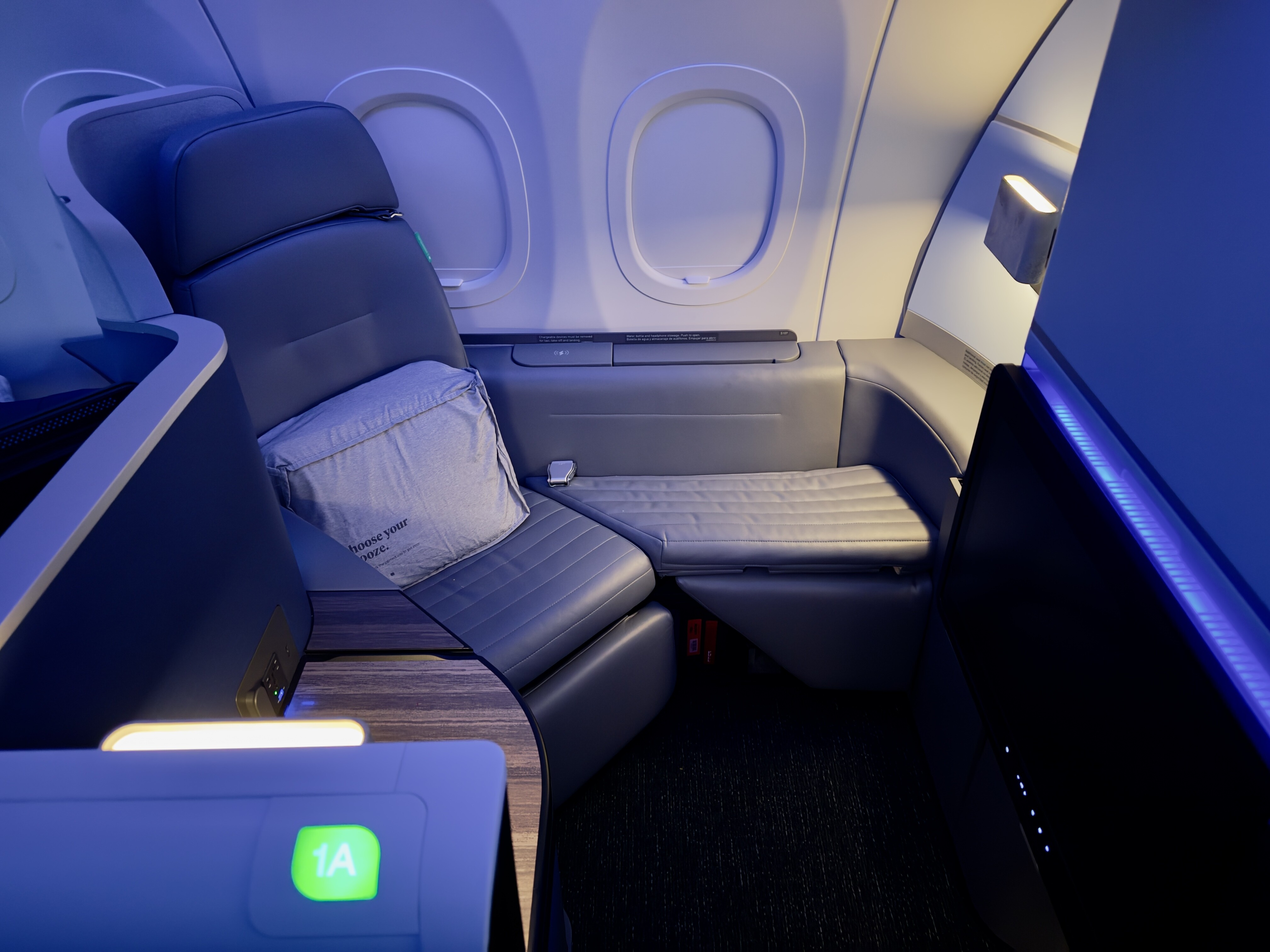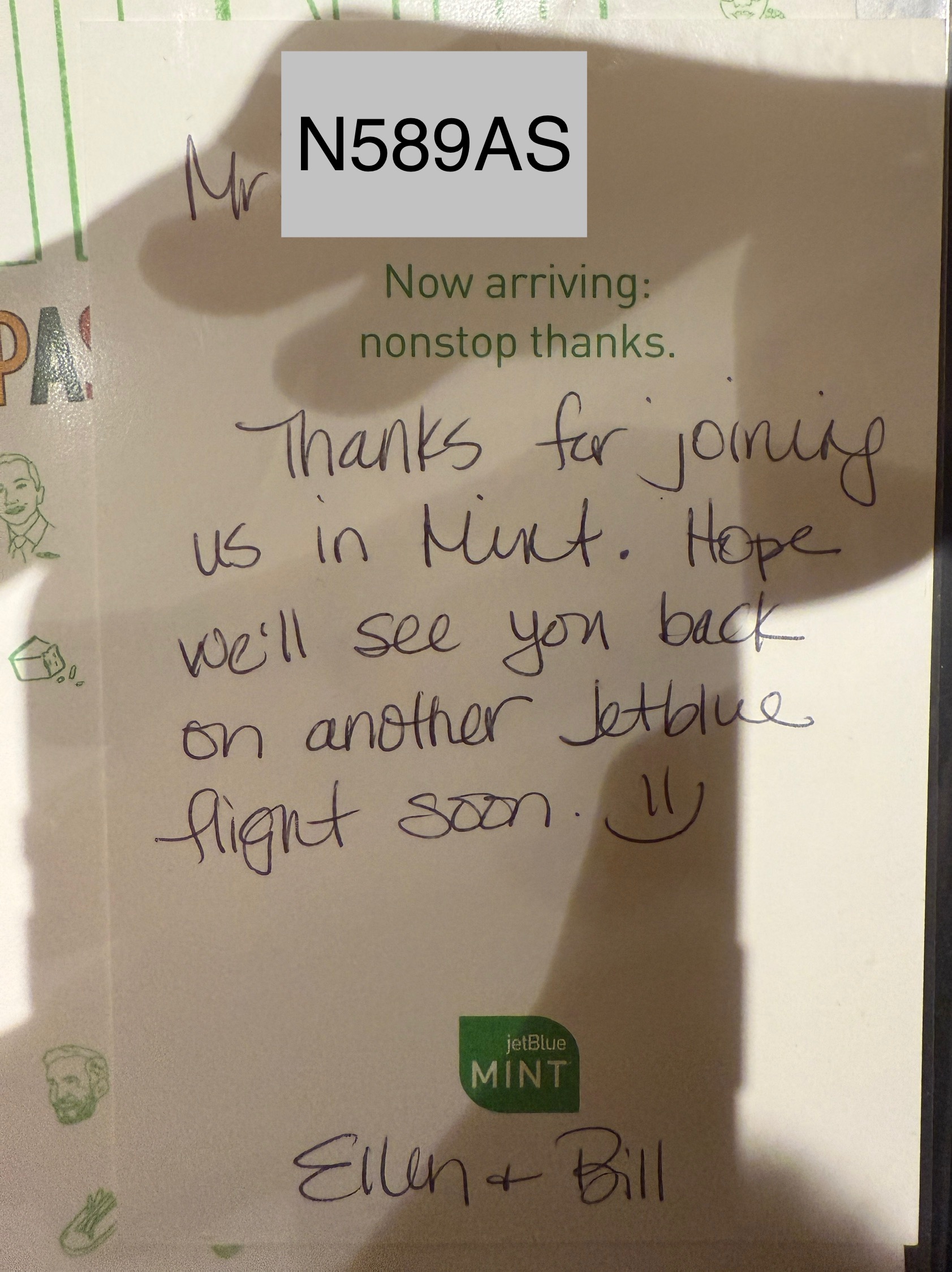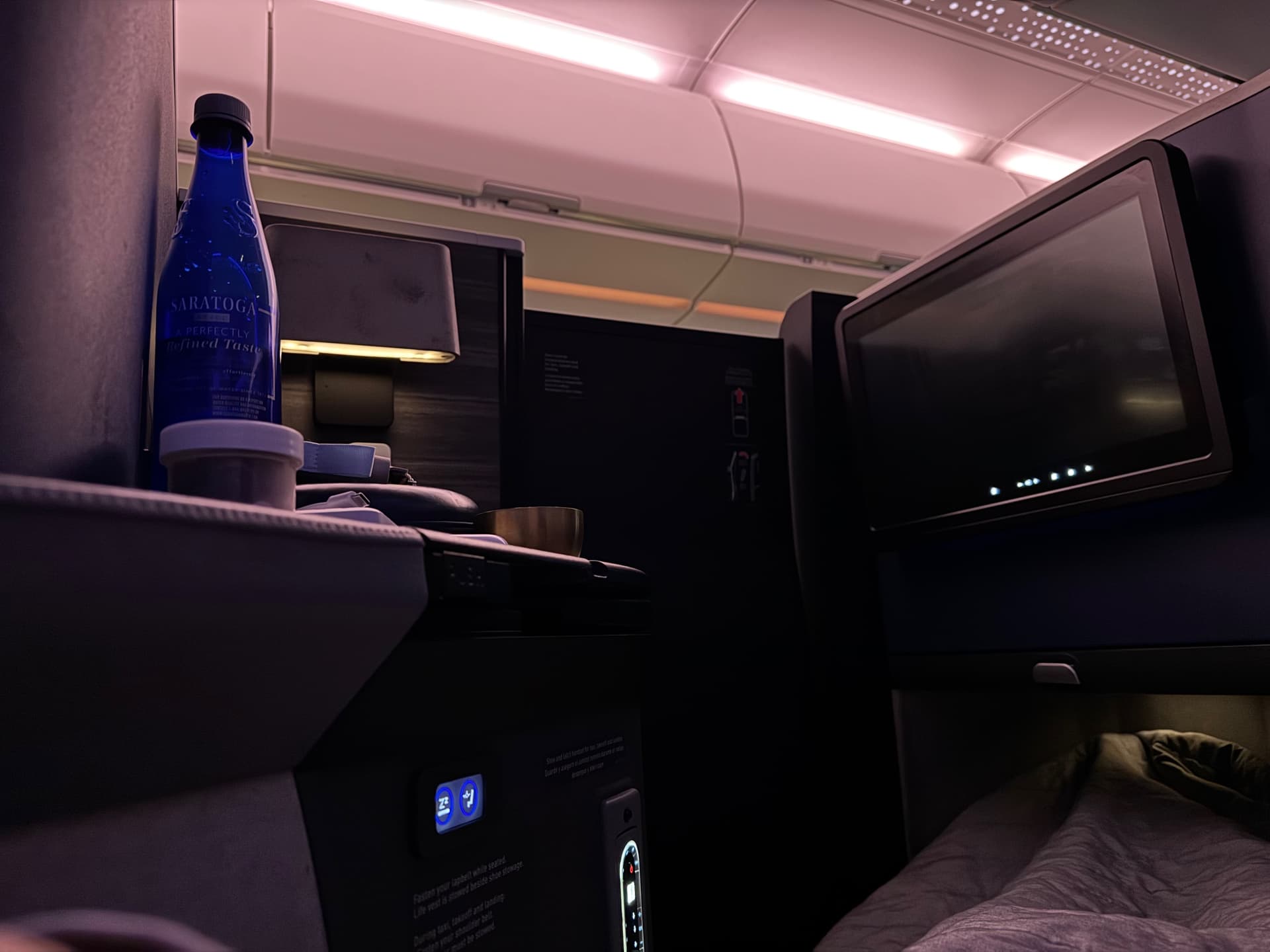 这次航行在JFK航站楼的体验不是很好,出发时B6自营休息室尚未启用,只得吃了一顿溢价满满的机场餐。A321neo机型商务舱采用单排双座隔间布局,独立推拉门设计私密性极佳,平躺无压力;但机身狭长导致过道略显局促。