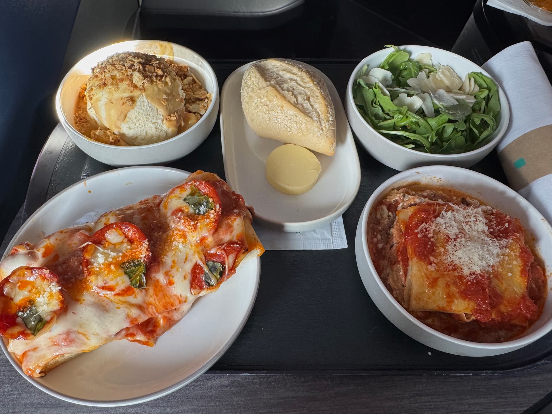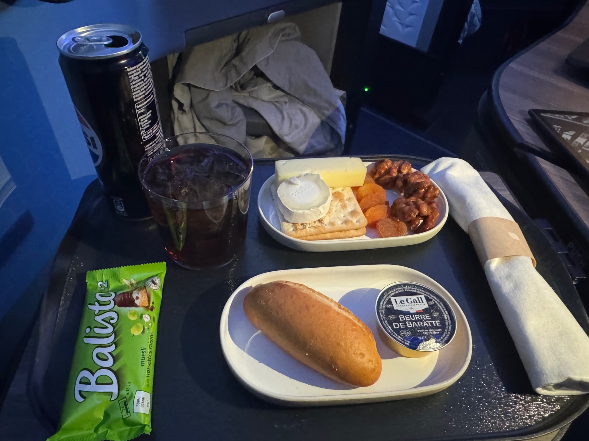 图片依次展示了JFK-CDG的晚饭,CDG-JFK的午饭以及落地前的点心。我由于去程睡得太沉错过了落地前的早饭,乘务组贴心提供了外带餐盒(含酸奶、能量棒等),然而总体而言这一路的餐食乏善可陈。餐点的烹饪非常美式,又咸又酸又腻,吃完之后肚子甚至不太舒服。