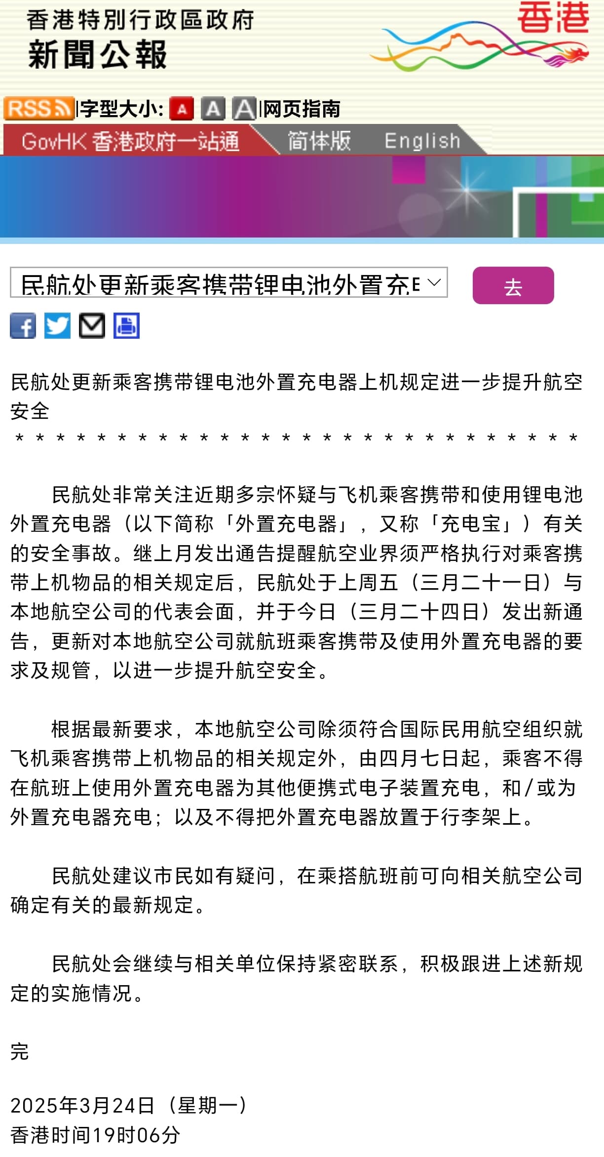 民航处非常关注近期多宗怀疑与飞机乘客携带和使用锂电池外置充电器(以下简称「外置充电器」,又称「充电宝」)有关的安全事故。继上月发出通告提醒航空业界须严格执行对乘客携带上机物品的相关规定后,民航处于上周五(三月二十一日)与本地航空公司的代表会面,并于今日(三月二十四日)发出新通告,更新对本地航空公司就航班乘客携带及使用外置充电器的要求及规管,以进一步提升航空安全。