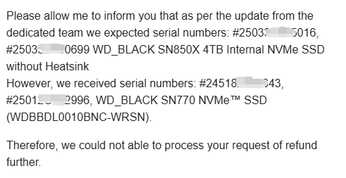 SanDisk 拒绝退款,然后把我的产品退回来了,我退的是完全没有开包装的 sn850x,退回来的是 SN770 1t 和 2t 而且是完全没有包装的。
