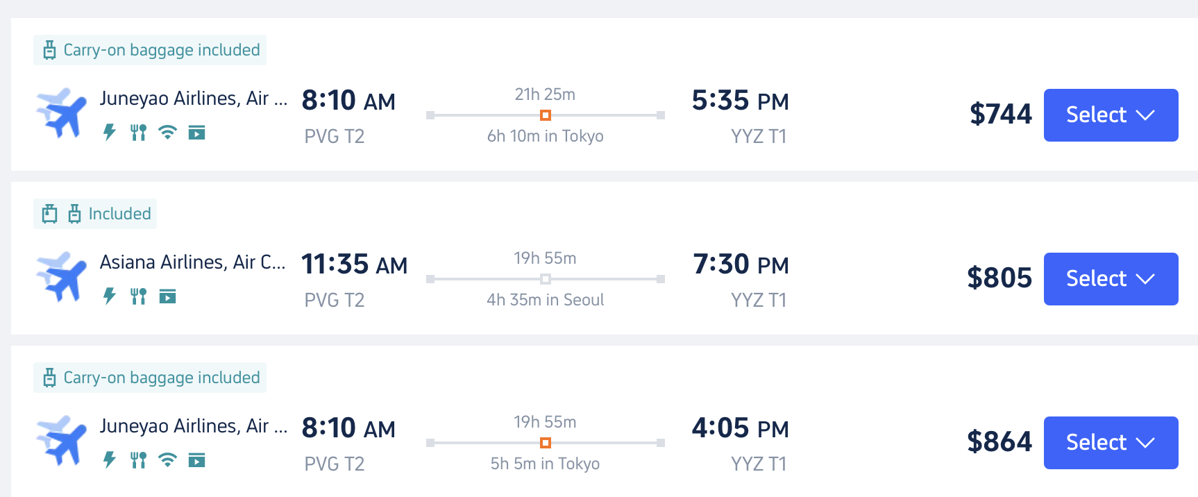 OK 那没办法只能看CX的票了,先用skyscanner查一下从PVG到YYZ的机票价格作为能否触发兑换的Bar,发现想飞的经济舱(包括check in baggage, 中转1次)最少700刀了(暑期真**贵啊)