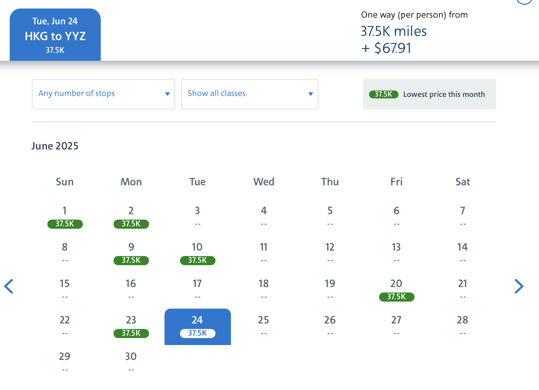 好的,开始重复查 HKG - YYZ 的直飞经济舱航班:CX自家同样38K显然不考虑,BA还是搜不出票(乐)、QR表示还是要带你去DOH……就在我AY查的筋疲力尽寻思就CX 38K PVG转机HKG到YYZ的时候,噌的一下突然跳出了2张AY Avios换CX HKG - YYZ的票!!!就那一天!竟然只要 35K Avios + 1064 HKD —— 假设长三角到香港的票是800人民币,算下来Avios也用出了 1.24 CPP