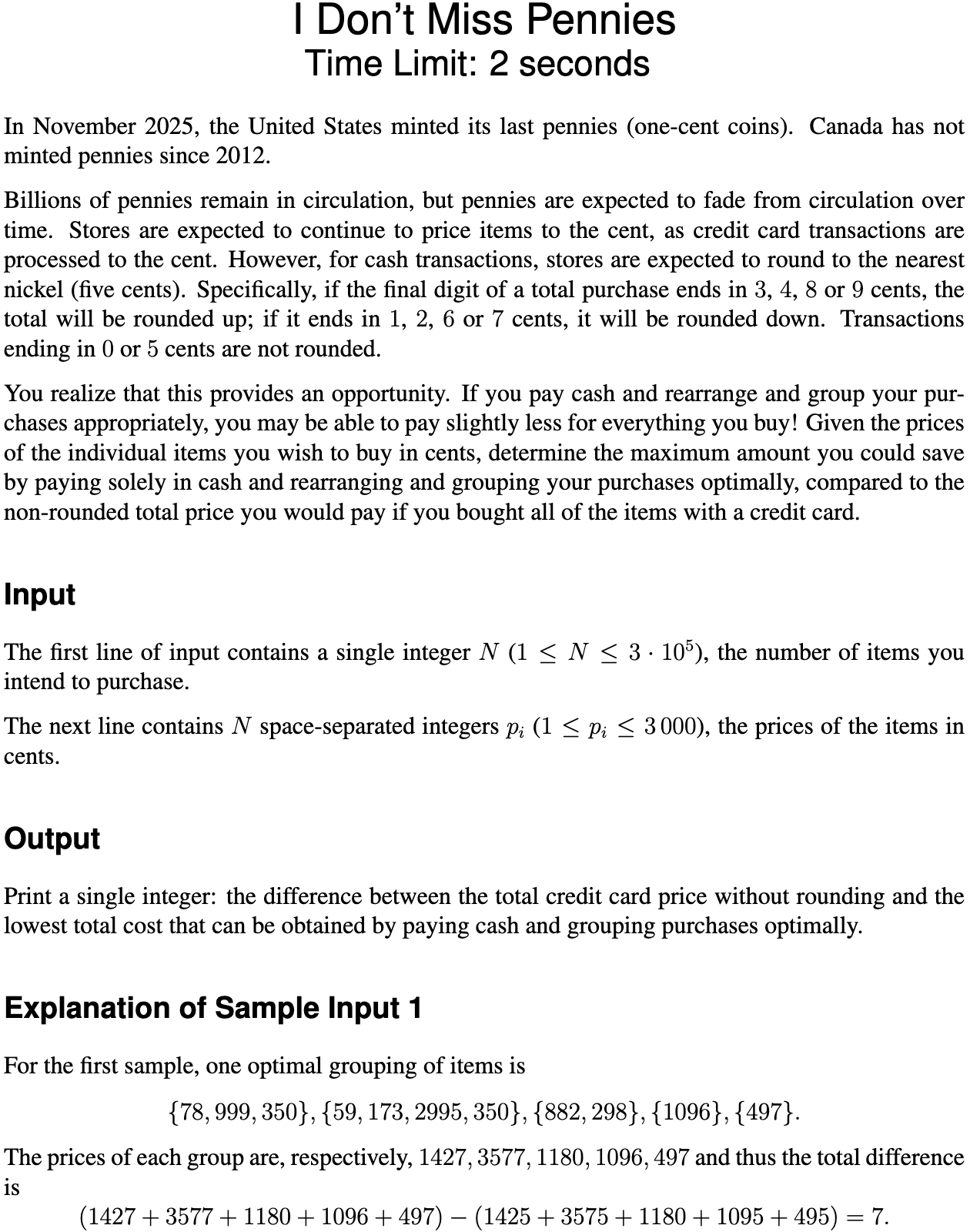 今天的题目是 2026 年 ICPC North America Championship 的另一道签到题。这是一道跟薅羊毛有关的题——I Don’t Miss Pennies ![]()