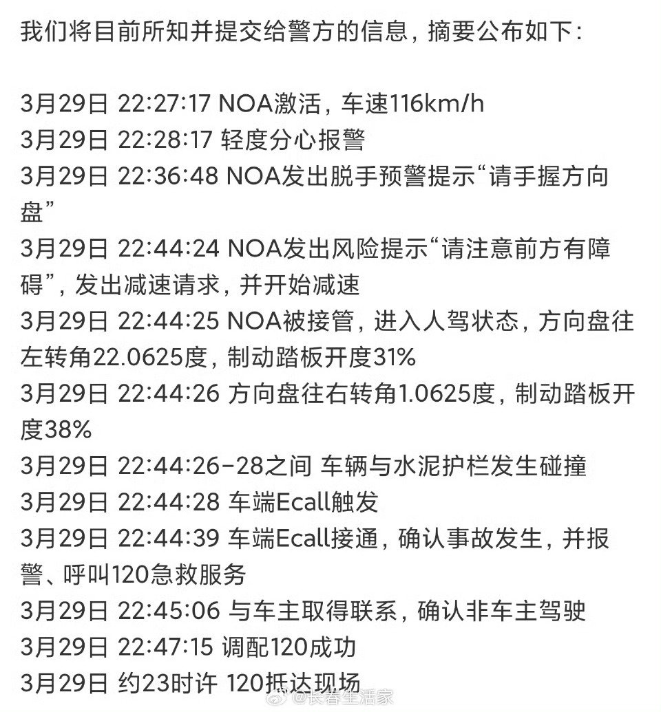 小米公布事件详情:据初步了解,事故发生前车辆处于NOA智能辅助驾驶状态,以116km/h时速持续行驶。事发路段因施工修缮,用路障封闭自车道、改道至逆向车道。车辆检测出障碍物后发出提醒并开始减速。随后驾驶员接管车辆进入人驾状态,持续减速并操控车辆转向,随后车辆与隔离带水泥桩发生碰撞,碰撞前系统最后可以确认的时速约为97km/h。将继续全力配合警方工作,并严格遵循调查结果,确保事件处理公开透明。