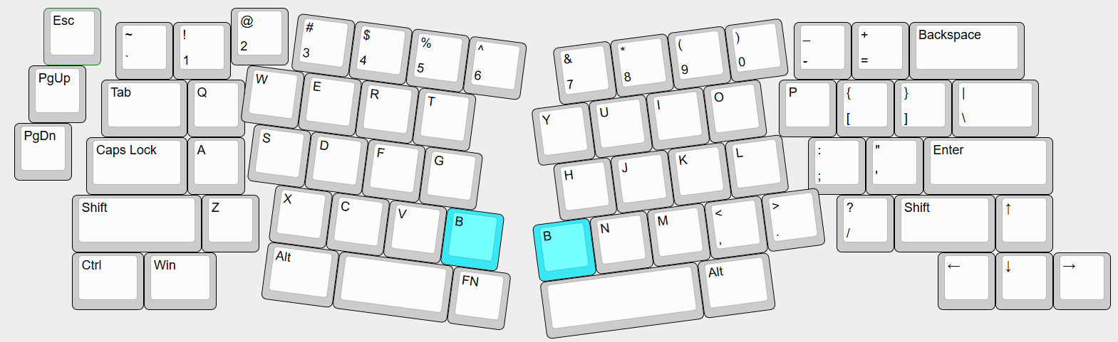 ,因此出现了一些针对人体工学做出改良的特殊配列,比如之前比较火的以两个B键为特征的Alice配列: