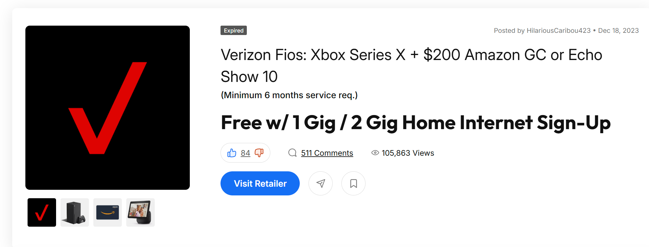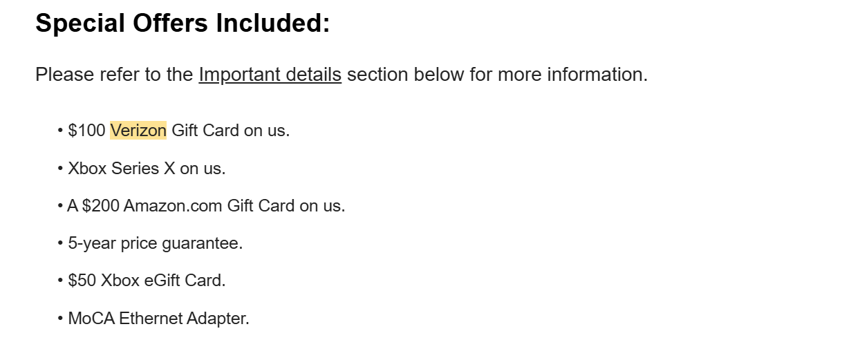 2023-12 1Gig/2Gig internet sign up => Xbox series X + $100 verizon gc + $200 amazon gc + $50 xbox gc