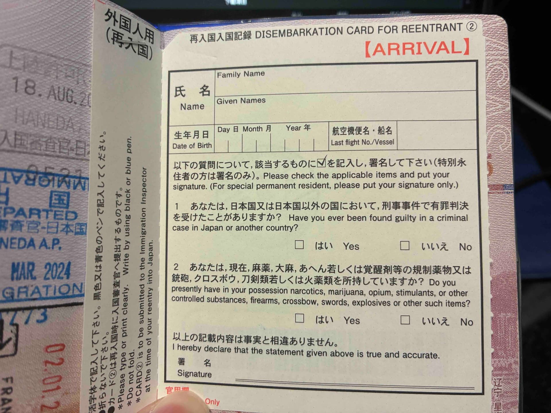 填写再入国EDカード