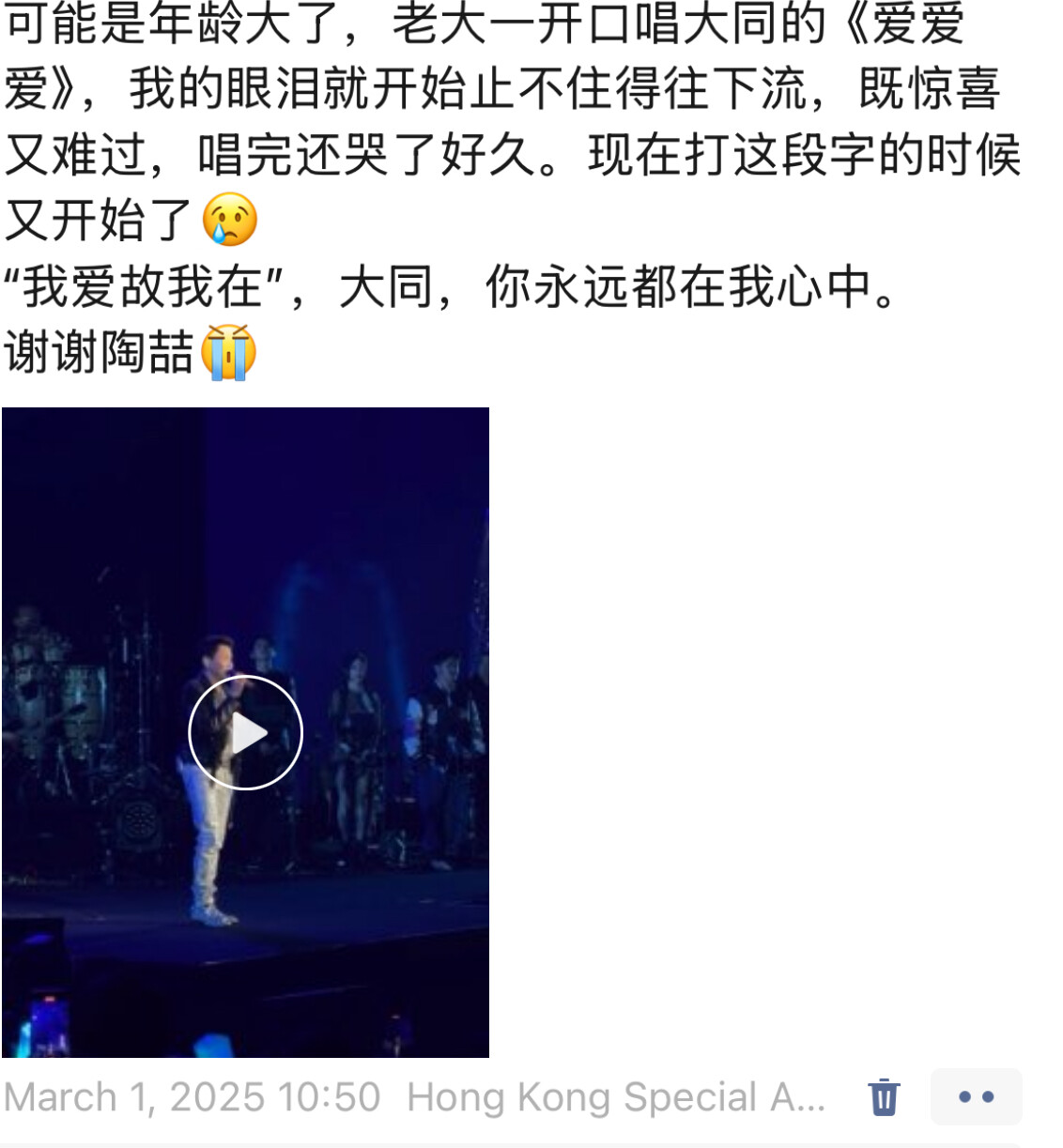 饭后我们步行前往红馆,因为人生地不熟,路上花了不少时间。我们俩坐下的时候,陶喆已经登台了。这场我期待许久的演唱会,却因为陶喆提及方大同去世的消息,让我的情绪瞬间从兴奋转为低落。当《爱爱爱》的旋律响起,我的泪水不由自主地滑落,接下来的歌几乎全程在含泪中听完