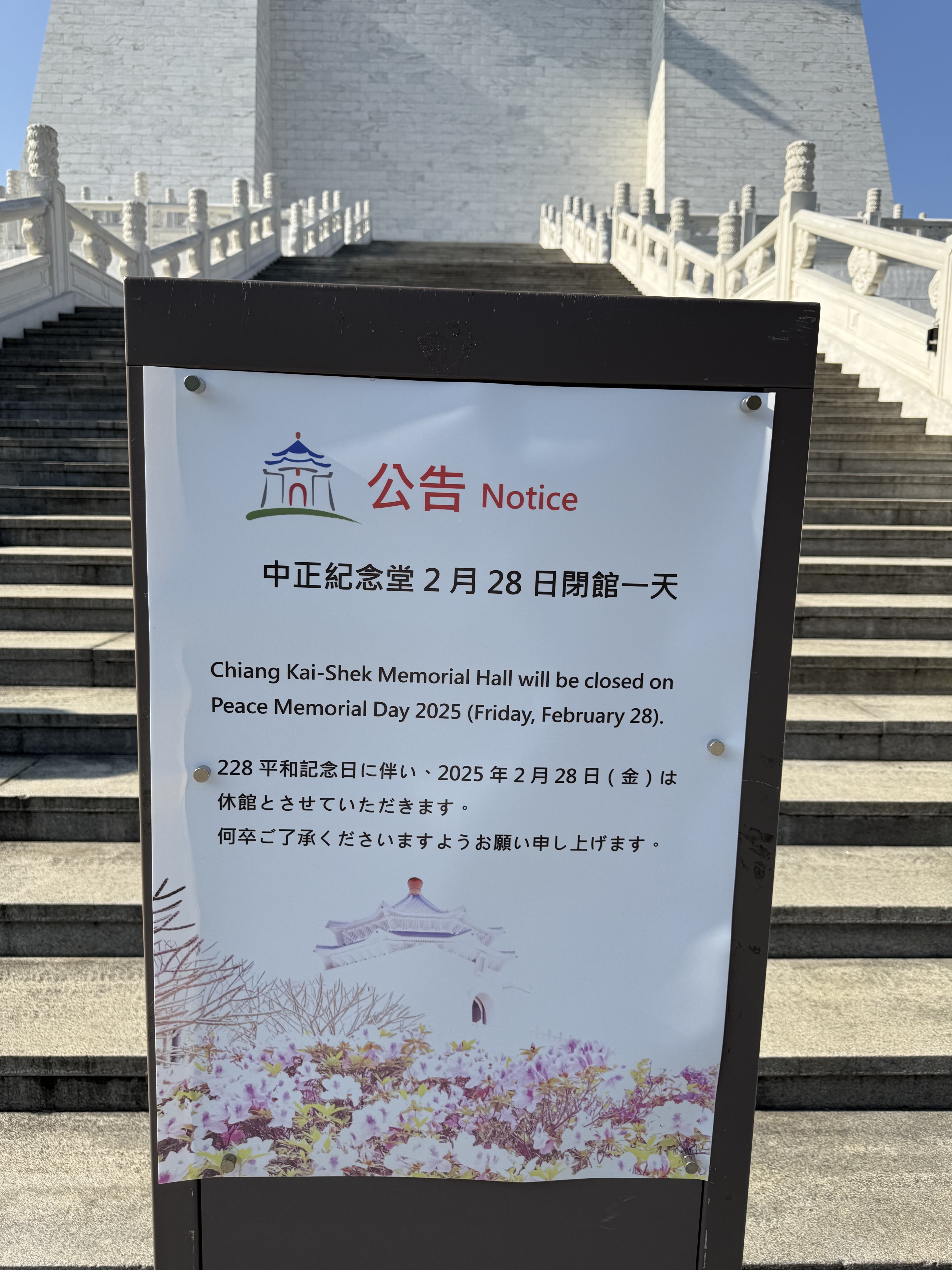 吃完饭顶着太阳步行走去了中正纪念堂,结果发现因2.28纪念日闭馆,扑了个空。没能一睹老蒋的宏威雕塑让这一日游瞬间失去了亮点。那天因为节假日,路上来来往往的人好像不多,节假日的街头行人稀少,我又随意逛了逛101附近商场就搭乘捷运回机场。