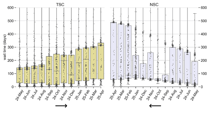 于是进一步把 NSC 和 TSC 拆开分析,可以到 NSC 确实比 TSC 慢了不少。2025 年 4 月,非 PP 处理到 2024 年 1 月,大概 NSC 要花 16 个月,TSC 要花 12 个月。