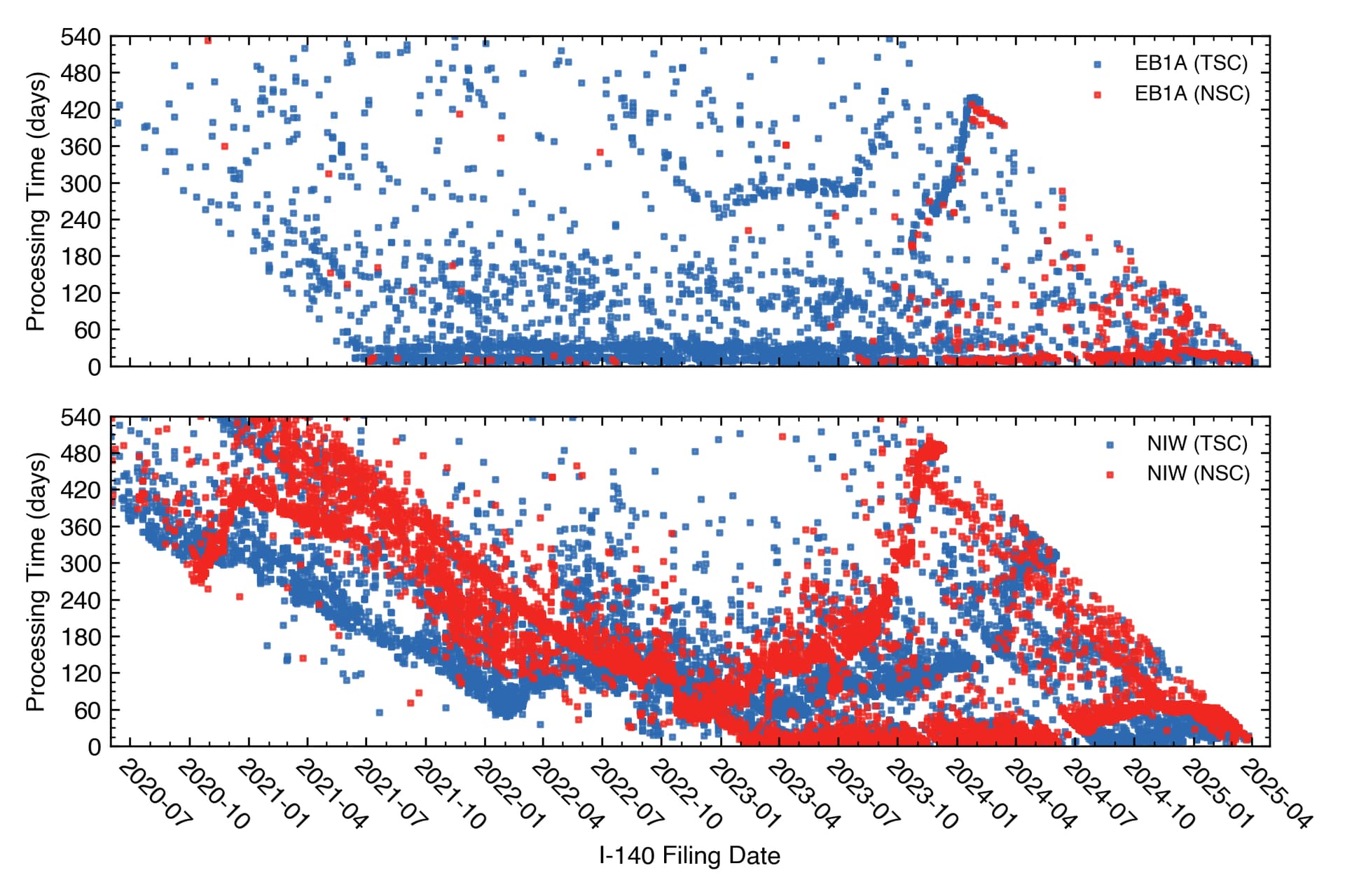 数据爬取了地里 WG 板块他们提供的表格并 OCR。我发现,把处理时间和 I-140 提交时间的散点画出来,趋势其实是非常有趣的。