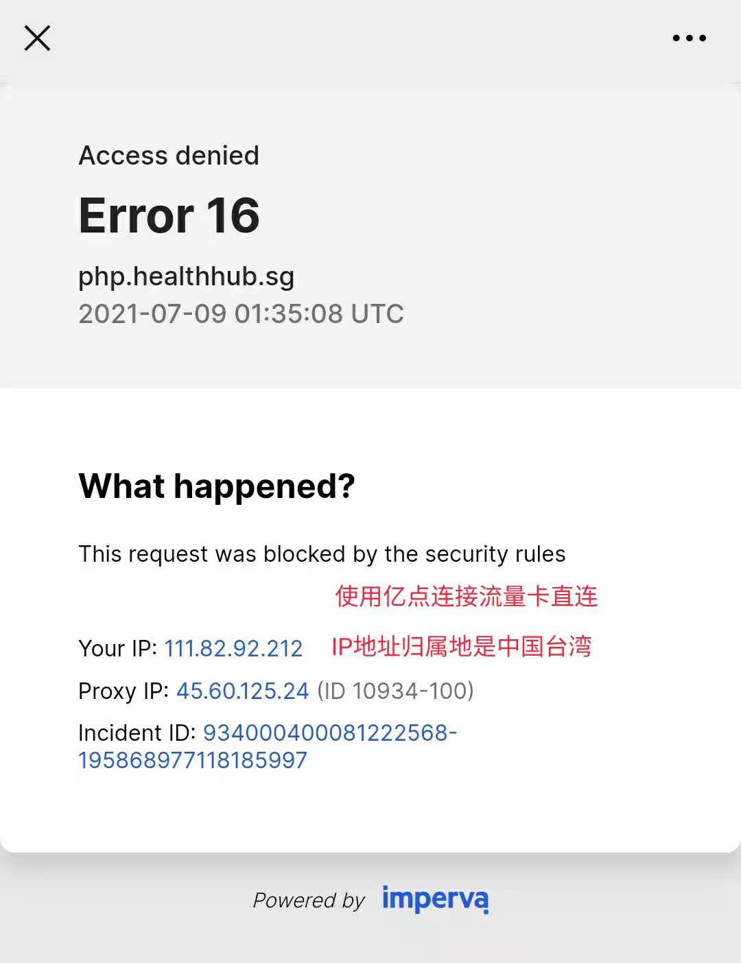 使用亿点连接的“新加坡电话卡”上网,因IP归属地被识别为台湾,无法完成新冠检测前必须填写的电子健康申报表。同时此电话卡不具备新加坡本地电话和短信功能,可能导致无法及时收到检测结果通知。