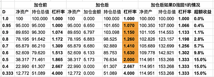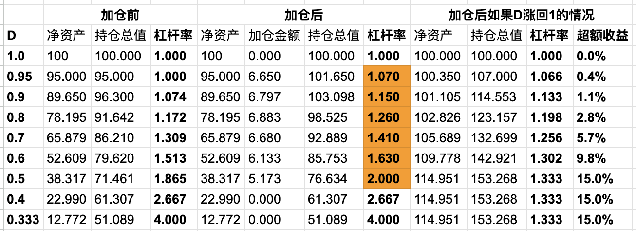 在D下跌的过程中用杠杆加仓,假设初始D=1,此时账户networth = 100,然后开始下跌,具体仓位管理和超额收益如下表,橙色代表每次主动加仓之后的杠杆率: