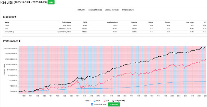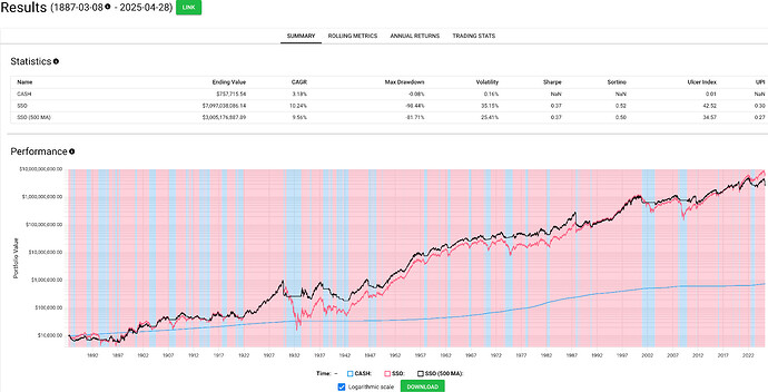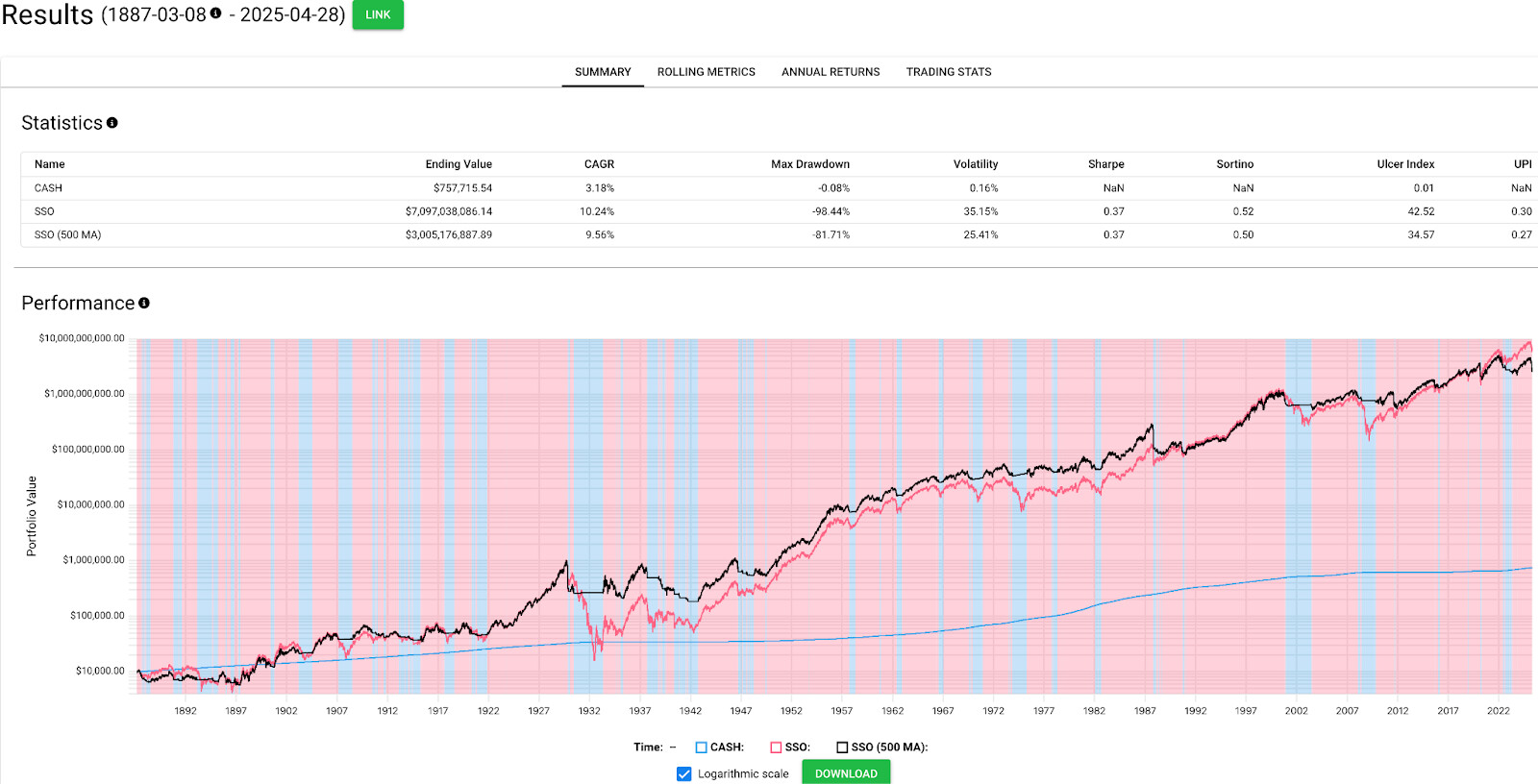 这几年比较火的另一个策略,我觉得这个它功能是在volatility大的时候空仓,从而降低volatility decay。长期回测结果也确实很优秀,收益和回撤都吊打Buy&Hold SSO。