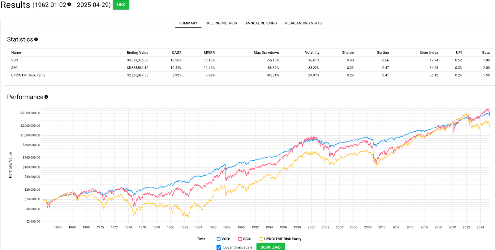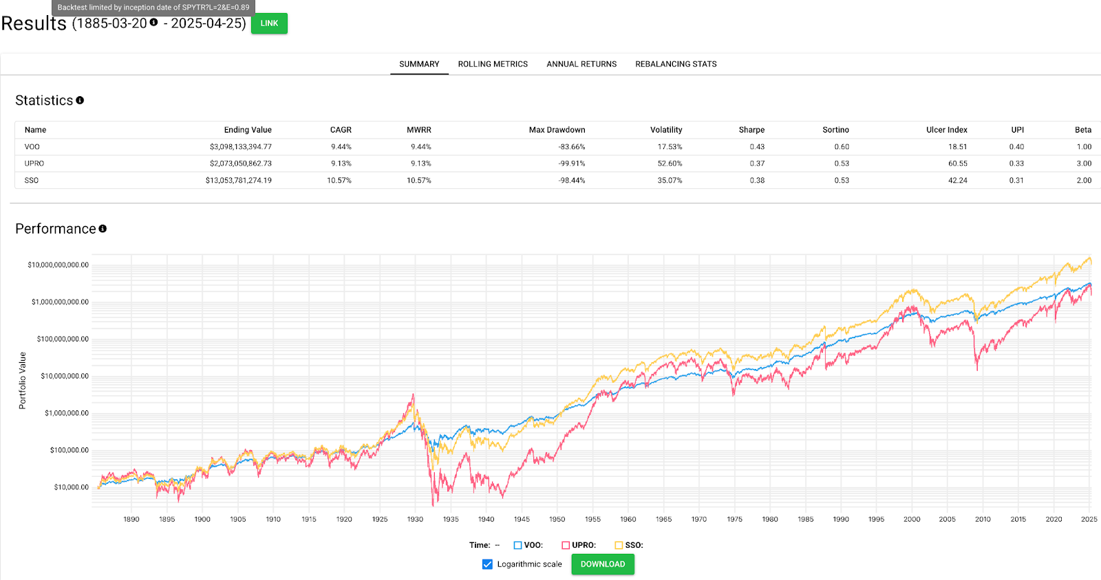 - 最大回撤和volatility虽然比SSO好一点,但是比VOO差远了。