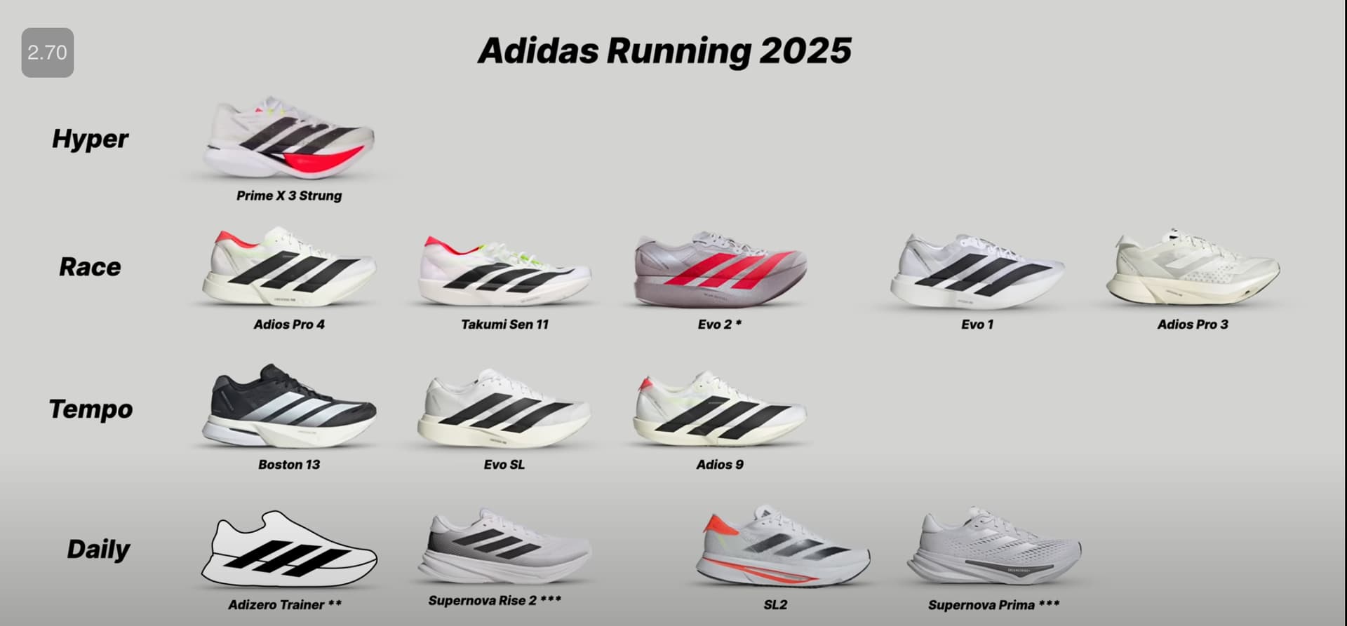 我个人觉得核心分类还是:设计到底是为了慢跑还是快跑。快跑鞋的训练鞋和比赛鞋的区别一般在于:极致的性能 vs 性能+耐久。以及通常来讲,训练鞋因为涉及跑操场或者间歇的设计,薄底鞋会多一些