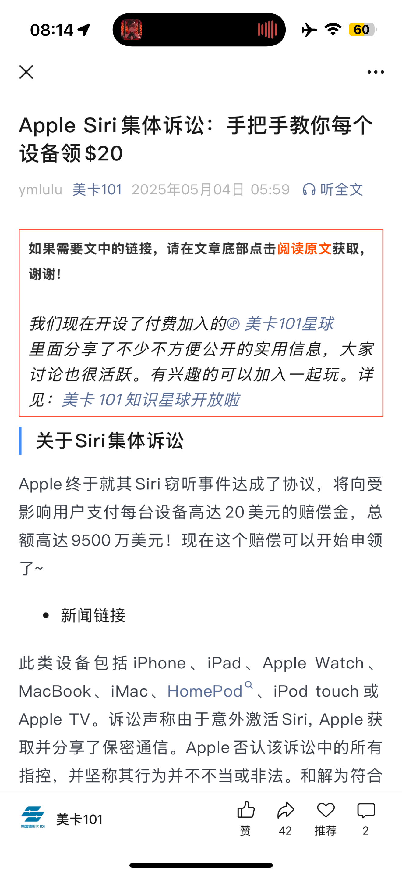 如果你在2014年9月17日至2024年12月31日期间在美国或其领地拥有/购买过支持Siri的设备(如iPhone、iPad、Apple Watch、MacBook、iMac、HomePod、iPod touch 或 Apple TV),且曾因Siri意外激活导致私人对话被录音并可能被苹果或第三方获取,现在你可能符合集体诉讼和解索赔资格!