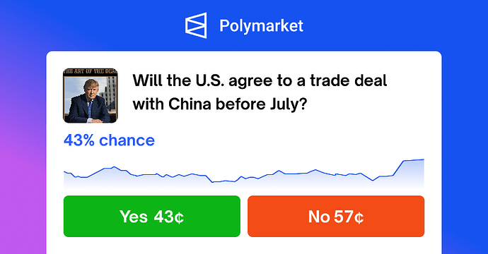 polymarket上中美七月前达成协议的盘口暴涨到43%,超越欧盟,澳洲了都
