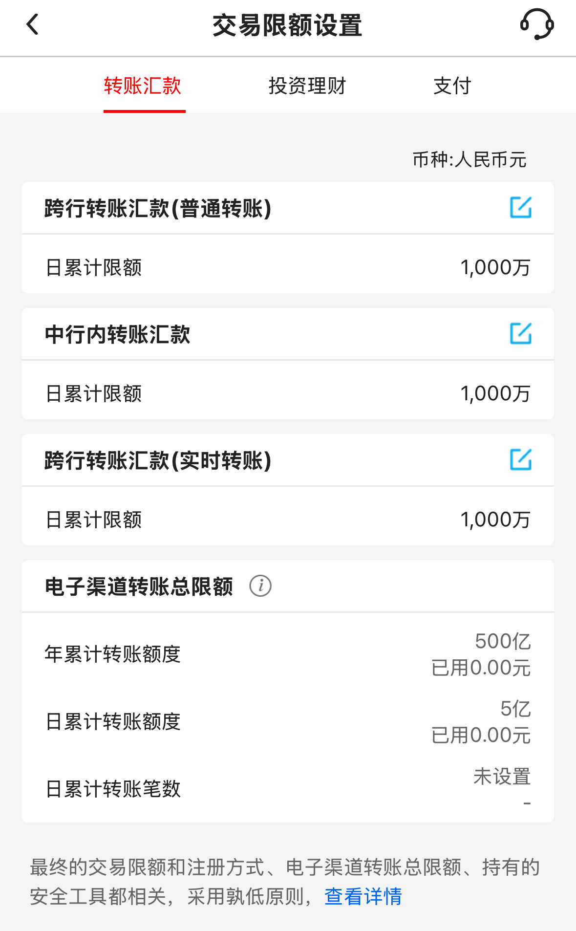 2)在我的设置里面看总的汇款限额,也是高得吓人,但这是总设置里面的,不知道是一类的还是二类的。如图二