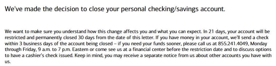 5月11号早上接到两封邮件,自己一个cherking账户一个联合账户都被关闭了,然后家人来信说卡也被关了,打电话问信用卡,客服说也关闭了,信在路上…………