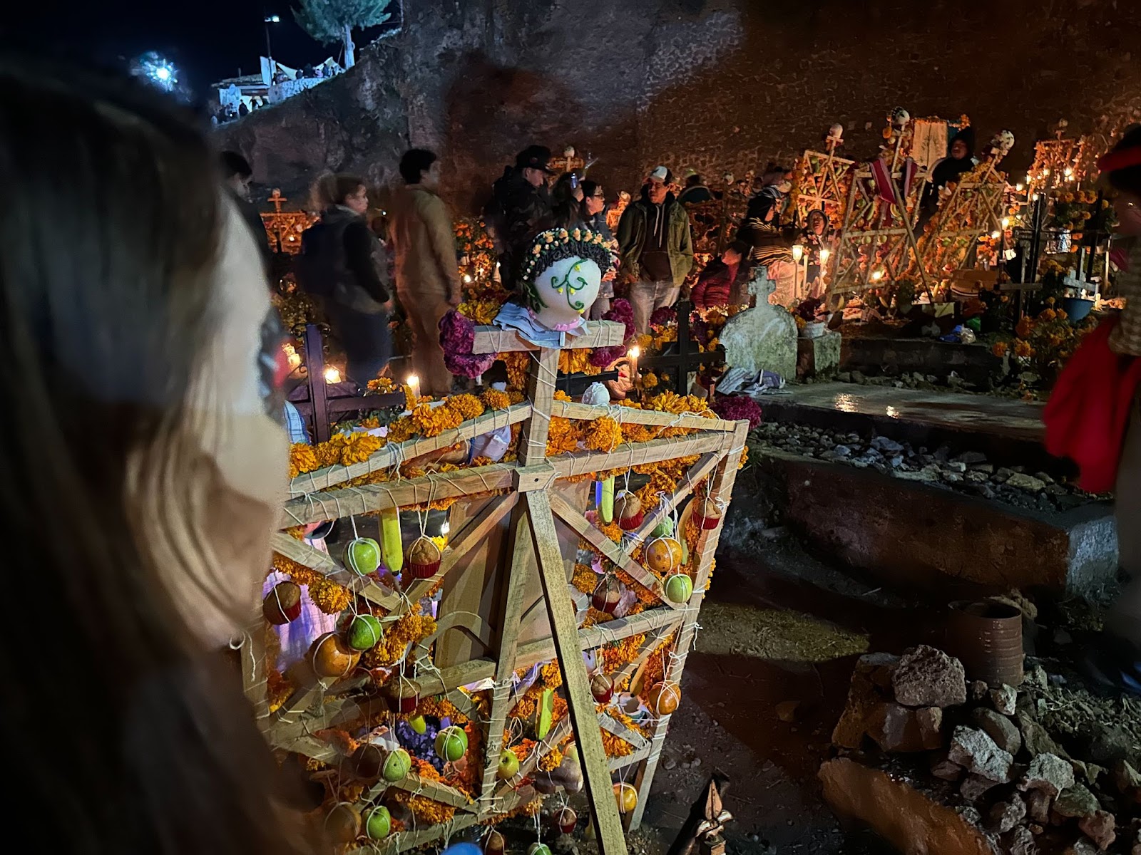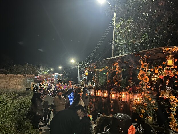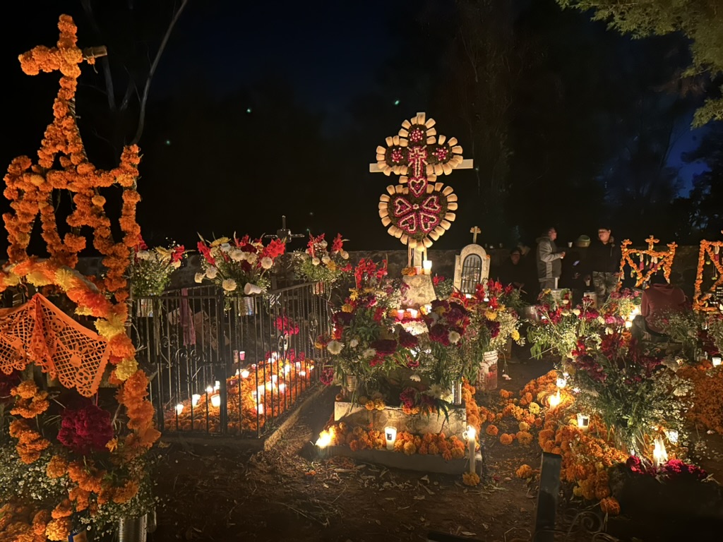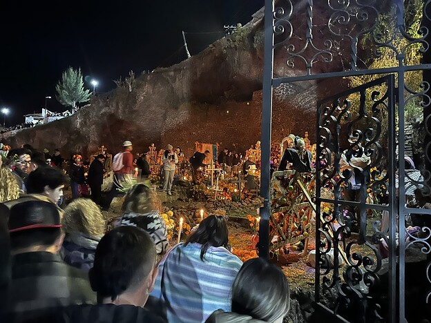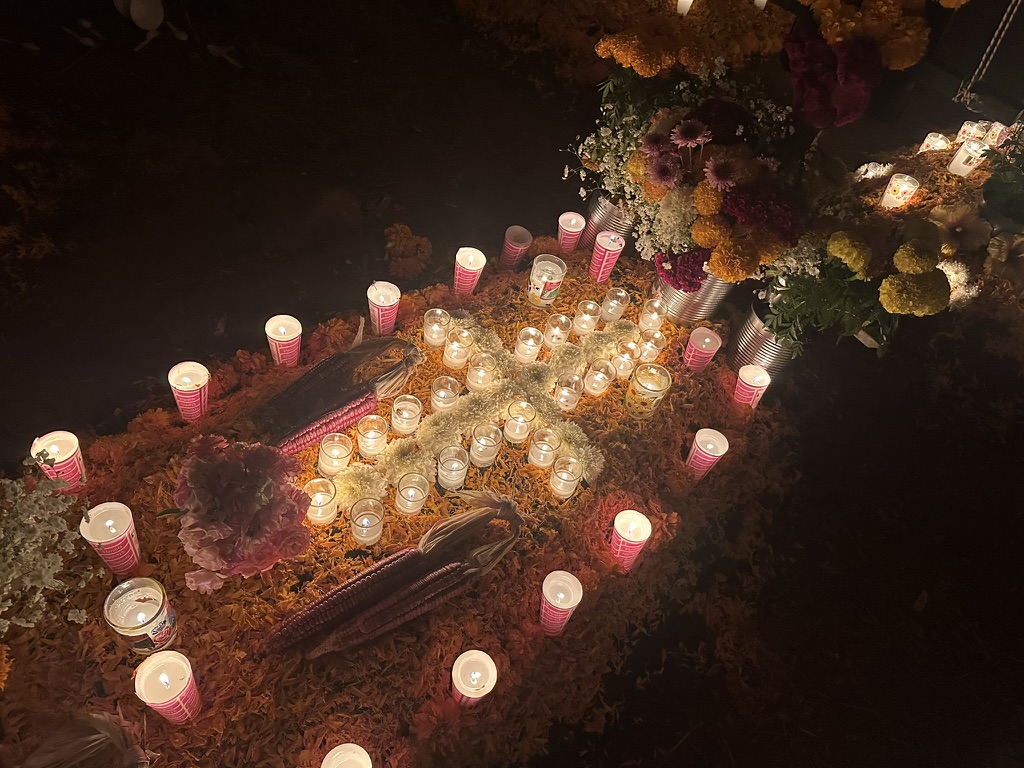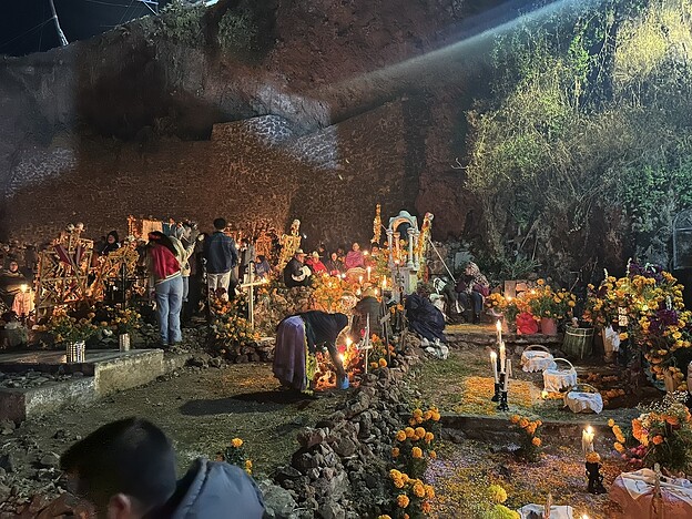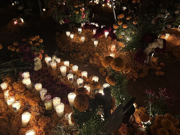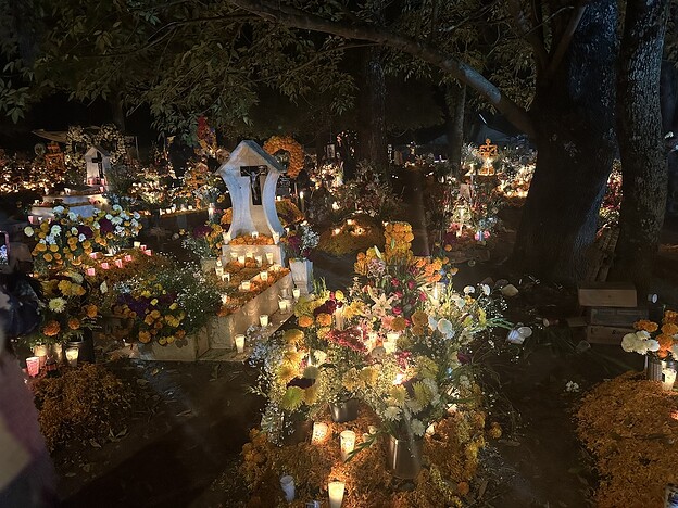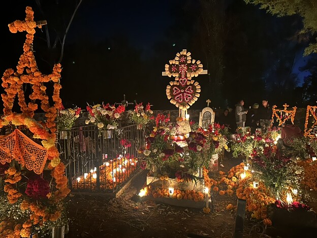 墓碑错落在夜色中,被大片盛放的万寿菊环绕。蜡烛的微光摇曳着,花篮静静点缀其间,有些十字架上挂着逝者生前的物品、照片,诉说着他们曾经的热爱与故事。而在另一些墓前仅有单一但数量巨大的金黄的万寿菊铺展。有的墓地旁边却围坐着几人,不知是亲人还是故友,他们围着火盆,轻声交谈,偶尔笑出声来。或许,是在回忆逝者生前的趣事,亦或仅仅是生者的家长里短,在这特定的节日夜晚,以温暖而平和的方式,与逝去的亲友共度一场跨越生死的团聚。