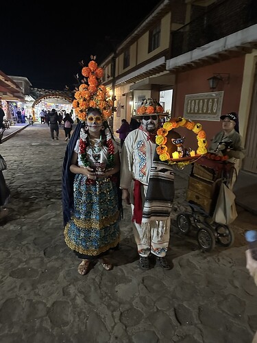 盛装打扮的当地人,男方手里拿的是一个Alebrije(灵魂动物),他选择的是一只无毛猫,纯手工制作的相当精良。