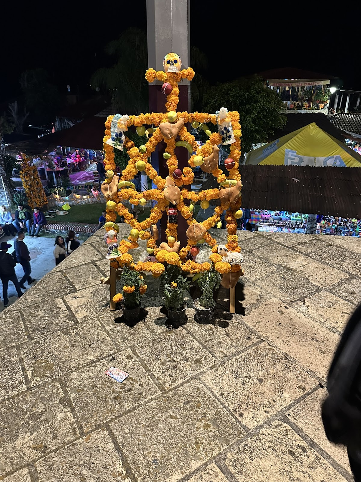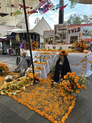 在墨西哥入境处就开始能看到亡灵节的布置了,一个小祭坛装饰着万寿菊和亡灵头像。不过因为入境处不允许拍照的原因没有留下影像。笔者掏出手机查资料还被呵斥要把手机收起来了。