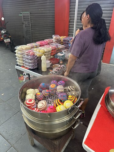 唐人街有很多小摊子卖这种五颜六色奇怪的馒头还是包子,没敢吃。