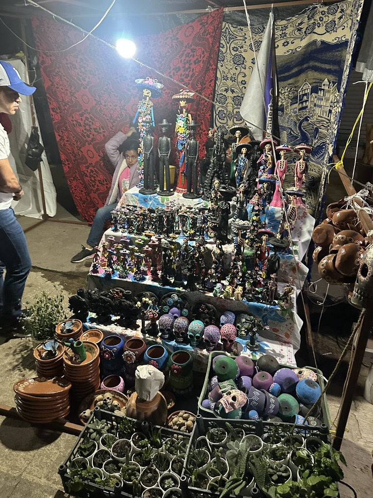 这个小镇是本次亡灵节之行的第一个景点。Capula 是米却肯州首府莫雷利亚(Morelia)以西约 20 公里的一座陶艺小镇,常住人口约 5 600 人,以其多彩的手工陶器和黏土 “La Catrina” 骨骷髅雕像闻名,被誉为 “黏土卡特里娜的故乡”。路边的集市和手工艺品市场能看到很多陶土的工艺品在出售。